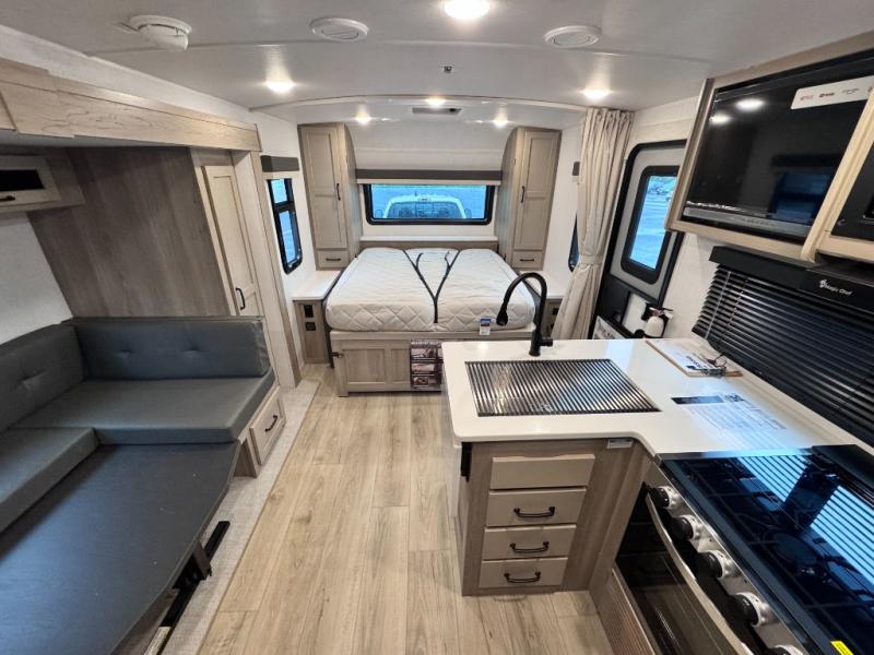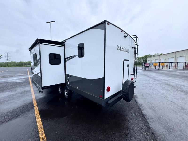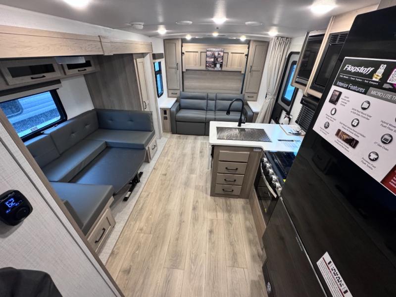 With any Flagstaff Micro Lite travel trailer by Forest River you will enjoy lightweight towing, durable construction, and added interior comforts to make each trip memorable! Each model features a torsion axle, Rubber-Ryde suspension, nitrogen filled, Goodyear Endurance tires, and easy lube axles with Nev-R-Adjust brakes for smooth towing from home to campground. The 6-sided aluminum framed construction provides a strong foundation so you can enjoy your RV for years to come, plus electronically controlled heated holding tanks and an enclosed underbelly will let you camp all year long. Head inside to find hybrid woven flooring in the slide outs, Sedona wood cabinetry, solid surface kitchen countertops, and many more amenities. These travel trailers also include exterior conveniences for hassle-free camping, like the power tongue jack, magnetic compartment door catches, Keyed Alike locks, and rear ladder to name a few!