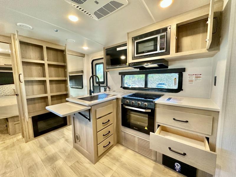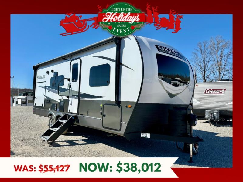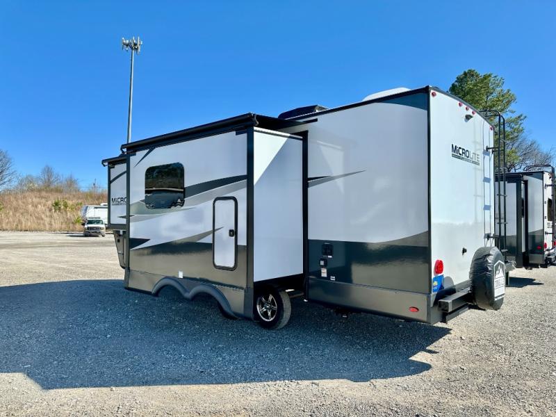 With any Flagstaff Micro Lite travel trailer by Forest River you will enjoy lightweight towing, durable construction, and added interior comforts to make each trip memorable! Each model features a torsion axle, Rubber-Ryde suspension, nitrogen filled, Goodyear Endurance tires, and easy lube axles with Nev-R-Adjust brakes for smooth towing from home to campground. The 6-sided aluminum framed construction provides a strong foundation so you can enjoy your RV for years to come, plus electronically controlled heated holding tanks and an enclosed underbelly will let you camp all year long. Head inside to find hybrid woven flooring in the slide outs, Sedona wood cabinetry, solid surface kitchen countertops, and many more amenities. These travel trailers also include exterior conveniences for hassle-free camping, like the power tongue jack, magnetic compartment door catches, Keyed Alike locks, and rear ladder to name a few!