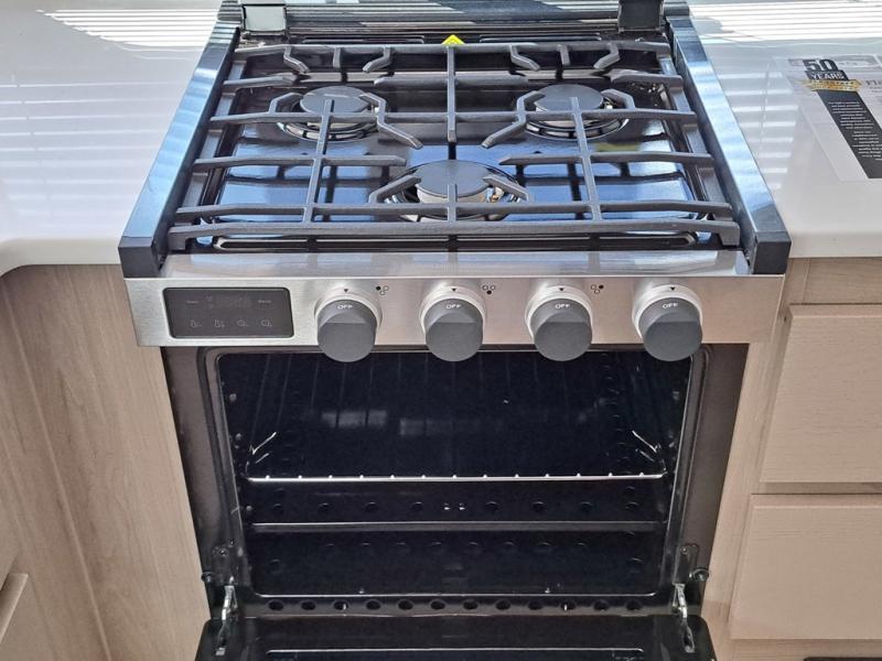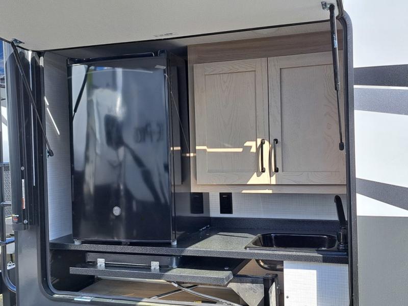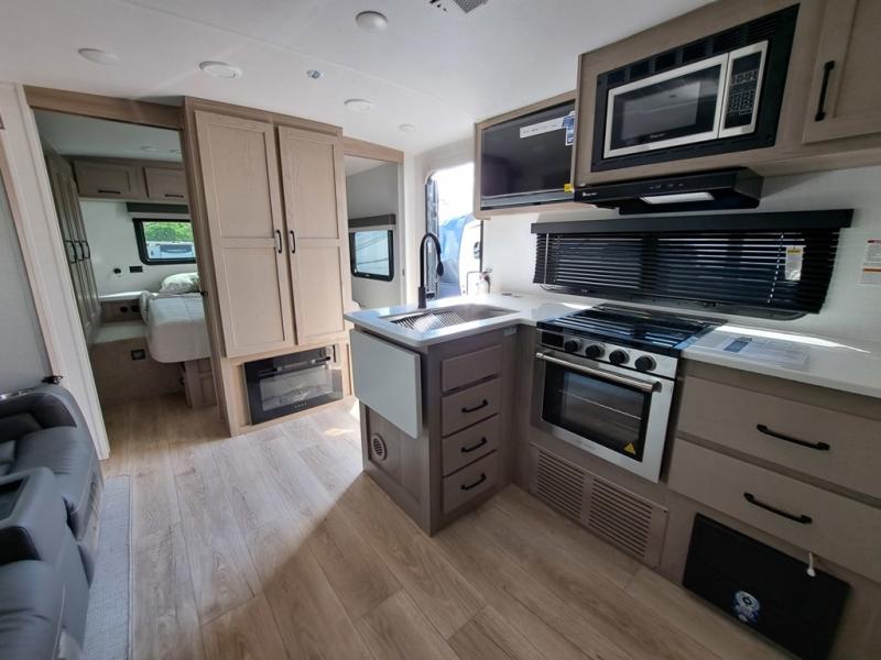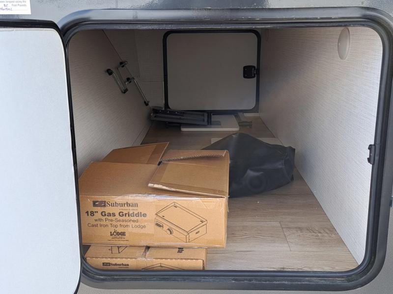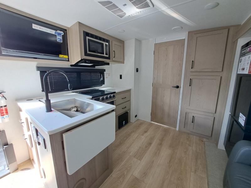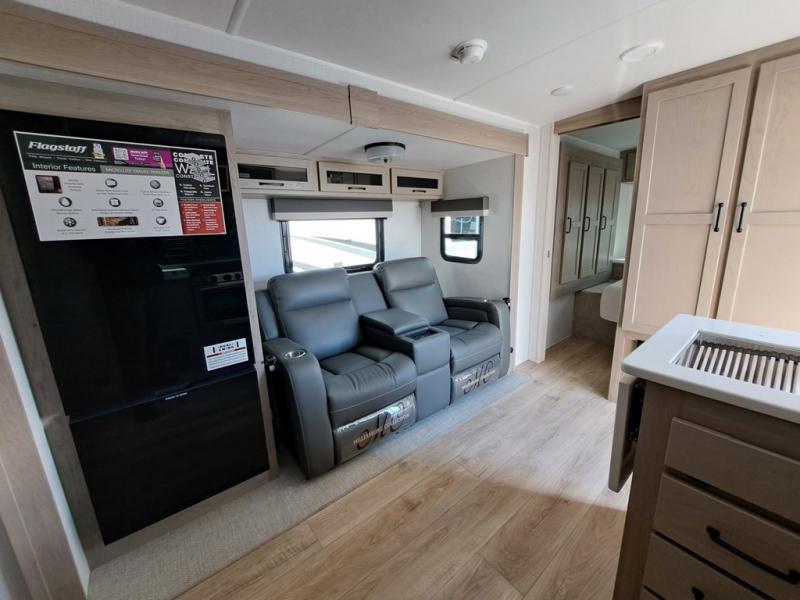 This excellent Flagstaff Micro Lite travel trailer has just what you want! There is a private bedroom with an RV queen bed and a wardrobe slide, and the kitchen provides you with a three-burner range, gas oven, double-bowl sink, and extra counter space. The 67" theater seating is perfectly placed across from the 32" TV, and there are also two pantries so you can grab a snack before sitting down to relax. The rear bathroom is full of all of the essentials, and there is also an outdoor kitchen on this model so that you can stay outside even while you are preparing dinner.