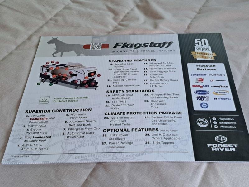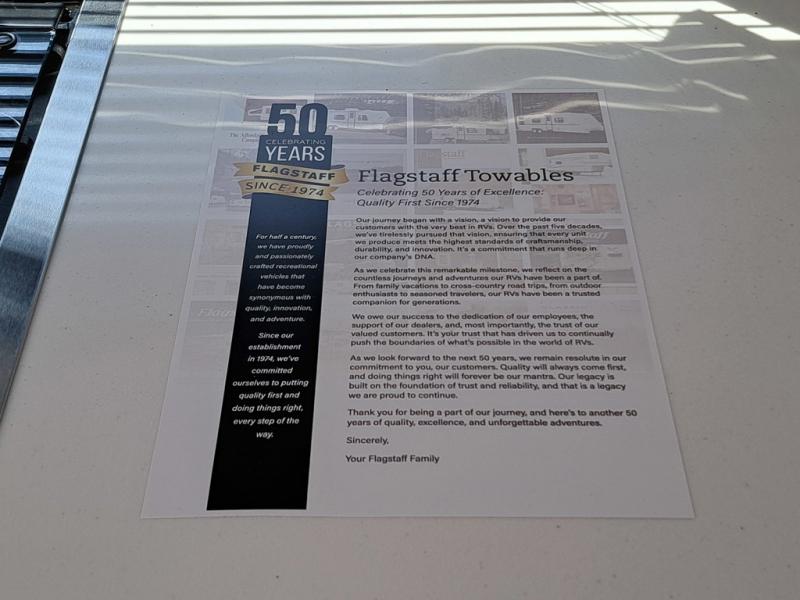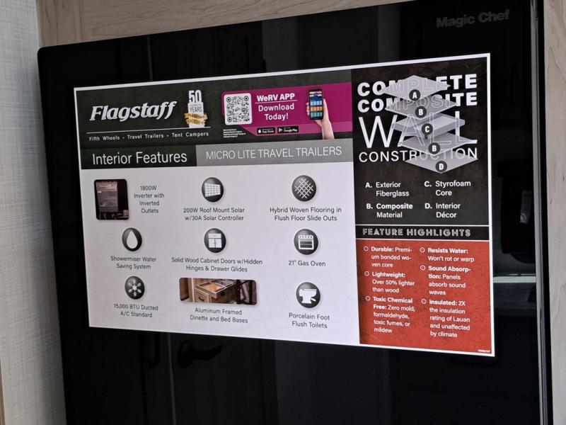 With any Flagstaff Micro Lite travel trailer by Forest River you will enjoy lightweight towing, durable construction, and added interior comforts to make each trip memorable! Each model features a torsion axle, Rubber-Ryde suspension, nitrogen filled, Goodyear Endurance tires, and easy lube axles with Nev-R-Adjust brakes for smooth towing from home to campground. The 6-sided aluminum framed construction provides a strong foundation so you can enjoy your RV for years to come, plus electronically controlled heated holding tanks and an enclosed underbelly will let you camp all year long. Head inside to find hybrid woven flooring in the slide outs, Sedona wood cabinetry, solid surface kitchen countertops, and many more amenities. These travel trailers also include exterior conveniences for hassle-free camping, like the power tongue jack, magnetic compartment door catches, Keyed Alike locks, and rear ladder to name a few!