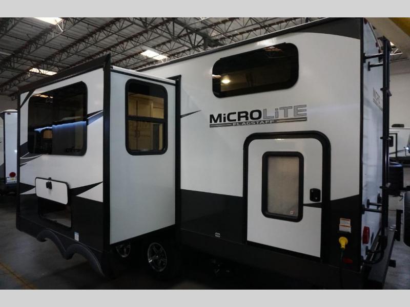 With any Flagstaff Micro Lite travel trailer by Forest River you will enjoy lightweight towing, durable construction, and added interior comforts to make each trip memorable! Each model features a torsion axle, Rubber-Ryde suspension, nitrogen filled, Goodyear Endurance tires, and easy lube axles with Nev-R-Adjust brakes for smooth towing from home to campground. The 6-sided aluminum framed construction provides a strong foundation so you can enjoy your RV for years to come, plus electronically controlled heated holding tanks and an enclosed underbelly will let you camp all year long. Head inside to find hybrid woven flooring in the slide outs, Sedona wood cabinetry, solid surface kitchen countertops, and many more amenities. These travel trailers also include exterior conveniences for hassle-free camping, like the power tongue jack, magnetic compartment door catches, Keyed Alike locks, and rear ladder to name a few!