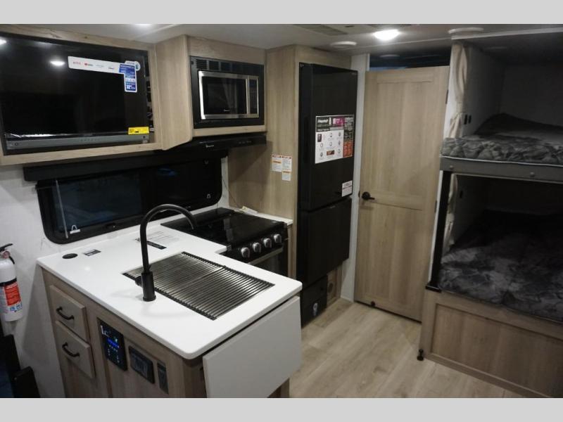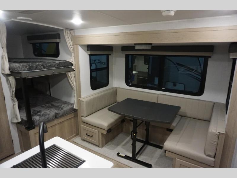 Camping in this single slide out travel trailer will make weekends at the campground comfy and hassle-free! Once you arrive, you can unload the pass-through storage, put out the 18' power awning, then make lunch on the exterior griddle. There is also a full interior kitchen to make meals when the weather isn't cooperating. Everyone can gather around the U-shaped dinette slide for meal times or game night, and there is a spacious pantry where you can store snacks! The bunk beds include a flip-up bottom bunk and an exterior bike door so you can easily pack camp gear away, and the full bath is right next to the bunks for easy nighttime use. Head up front to enjoy your own private bedroom with an RV queen bed, dual wardrobes, and flip-up storage!