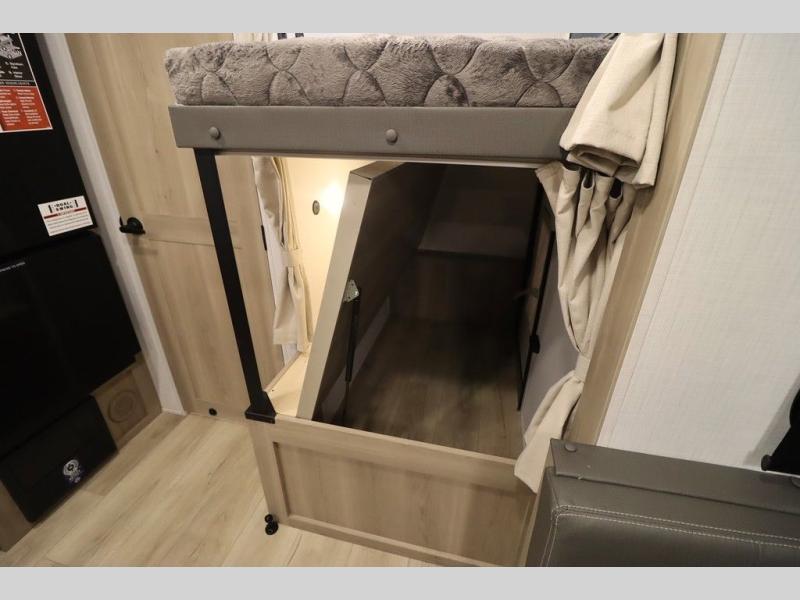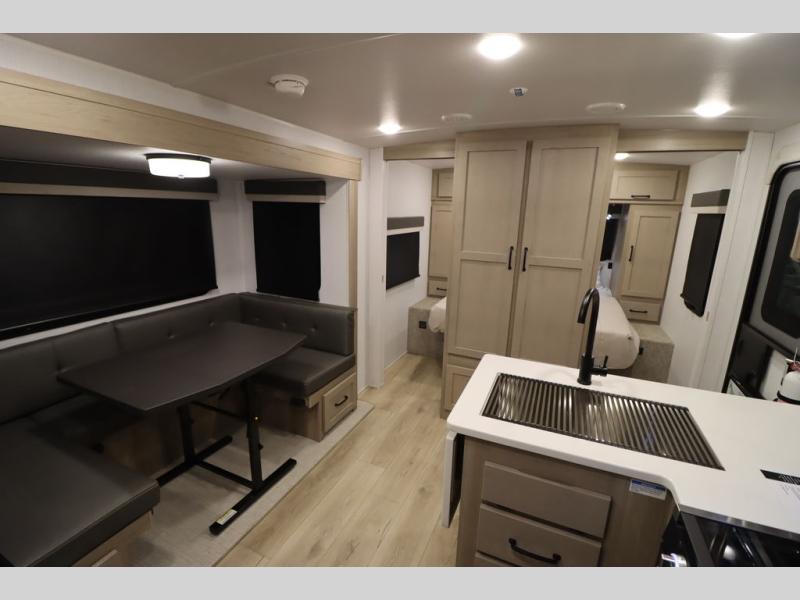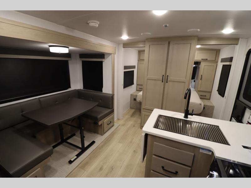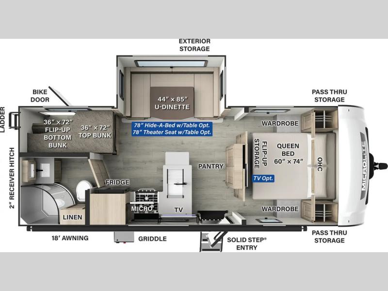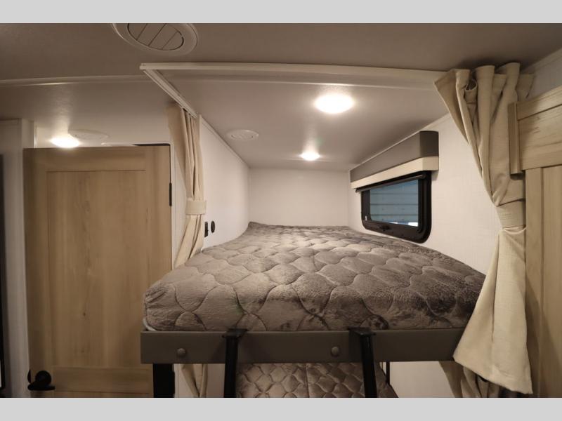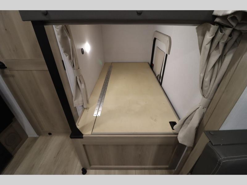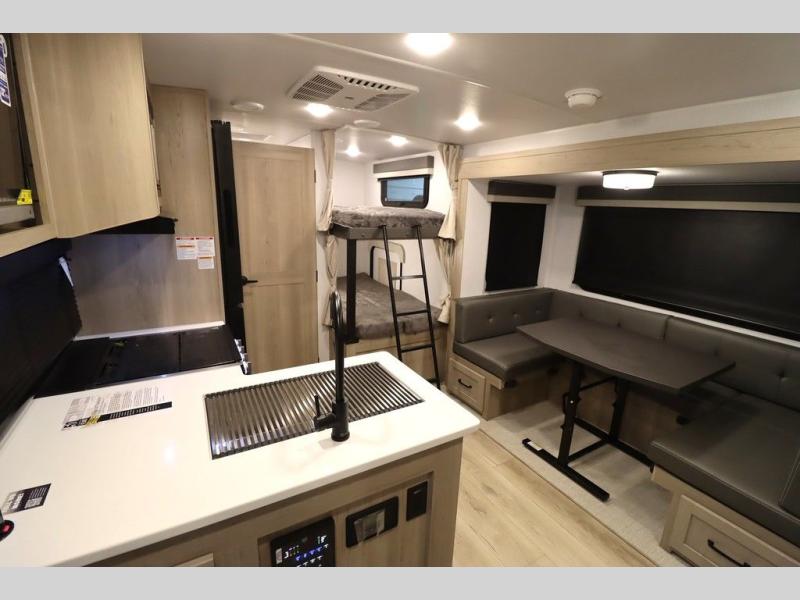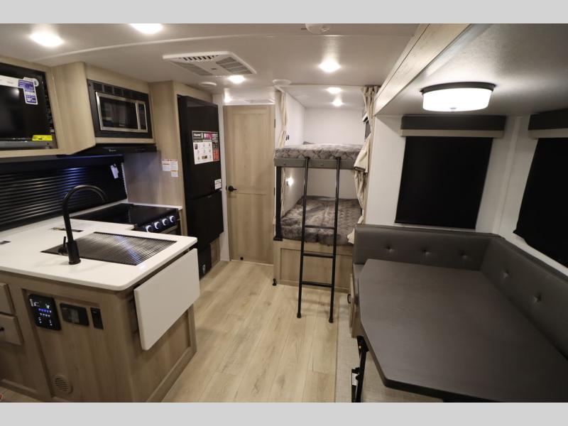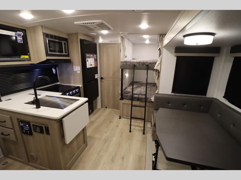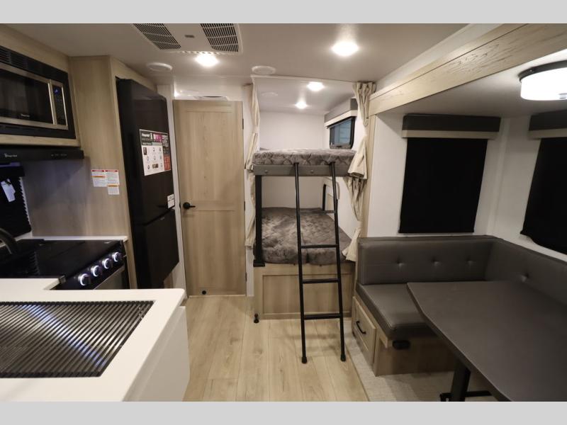 Camping in this single slide out travel trailer will make weekends at the campground comfy and hassle-free! Once you arrive, you can unload the pass-through storage, put out the 18' power awning, then make lunch on the exterior griddle. There is also a full interior kitchen to make meals when the weather isn't cooperating. Everyone can gather around the U-shaped dinette slide for meal times or game night, and there is a spacious pantry where you can store snacks! The bunk beds include a flip-up bottom bunk and an exterior bike door so you can easily pack camp gear away, and the full bath is right next to the bunks for easy nighttime use. Head up front to enjoy your own private bedroom with an RV queen bed, dual wardrobes, and flip-up storage!