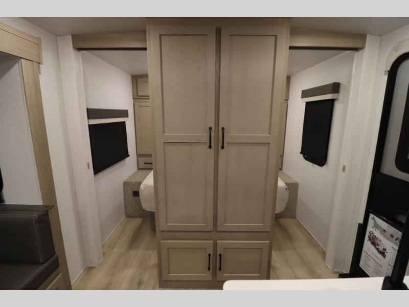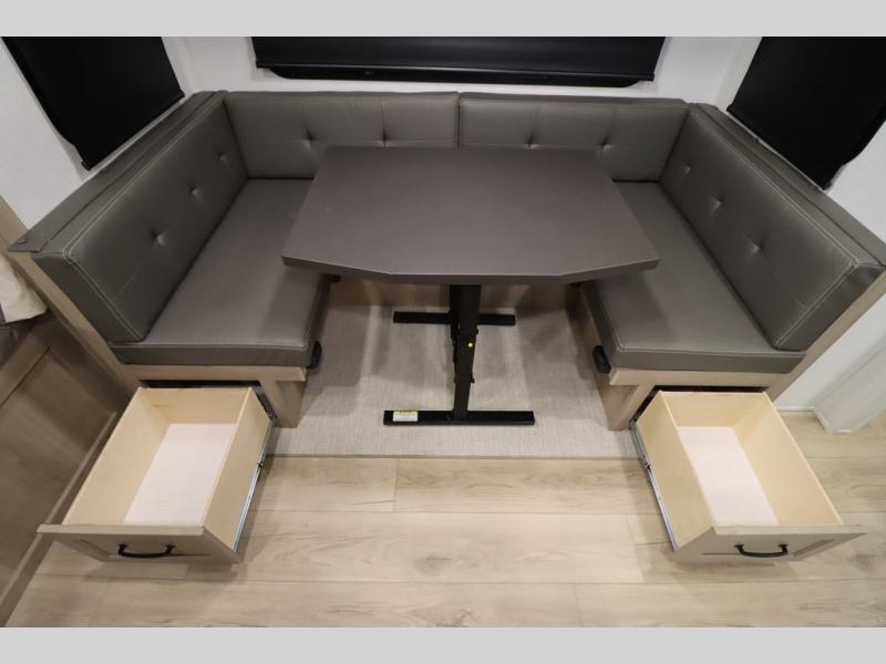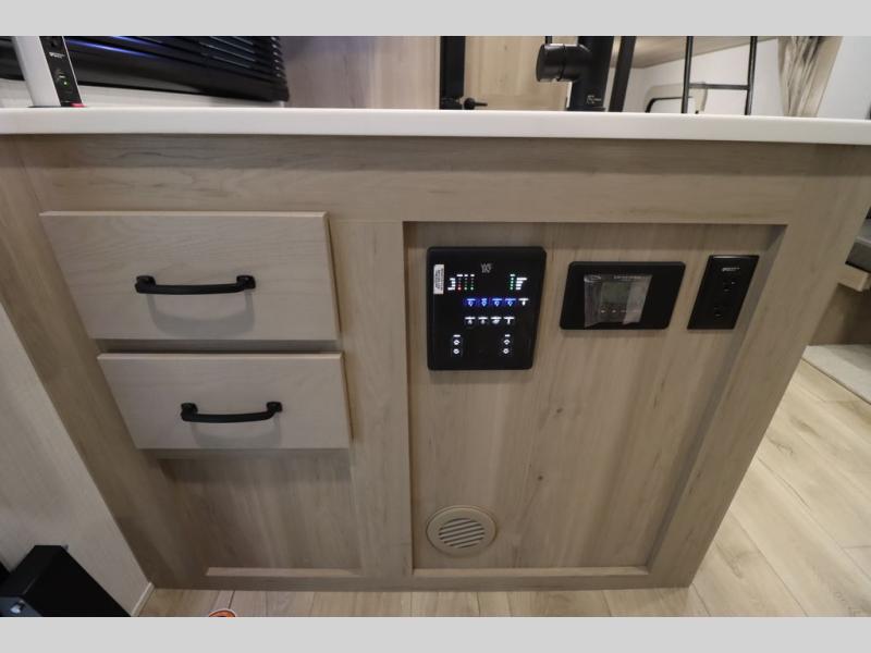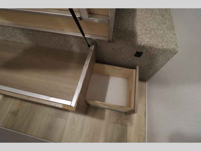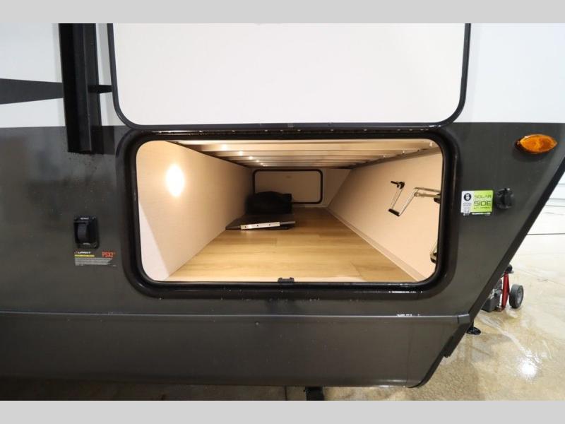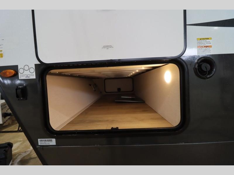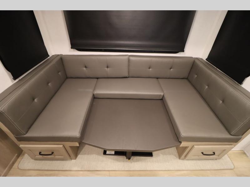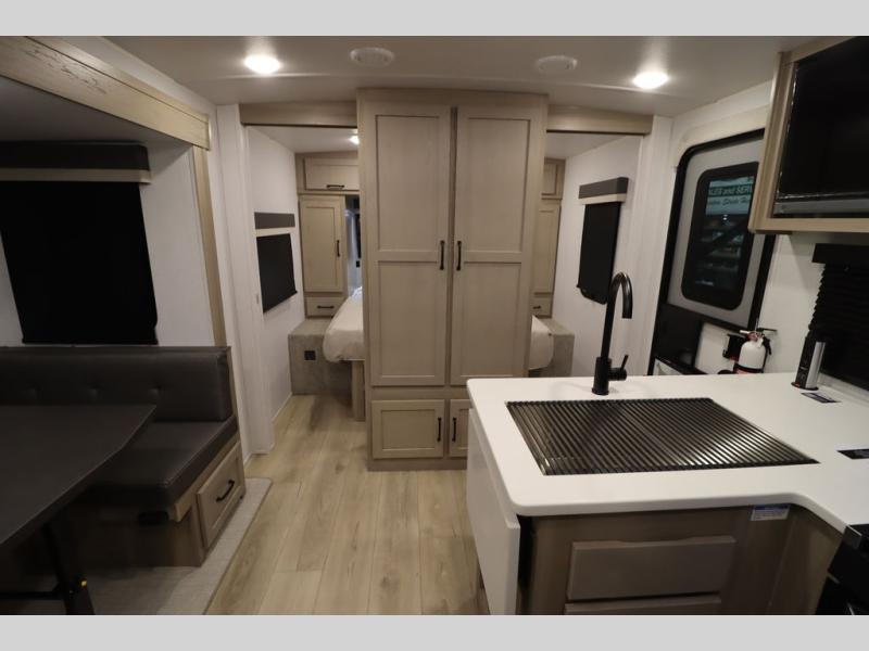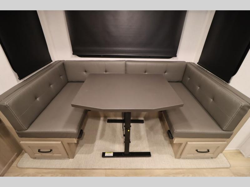 Camping in this single slide out travel trailer will make weekends at the campground comfy and hassle-free! Once you arrive, you can unload the pass-through storage, put out the 18' power awning, then make lunch on the exterior griddle. There is also a full interior kitchen to make meals when the weather isn't cooperating. Everyone can gather around the U-shaped dinette slide for meal times or game night, and there is a spacious pantry where you can store snacks! The bunk beds include a flip-up bottom bunk and an exterior bike door so you can easily pack camp gear away, and the full bath is right next to the bunks for easy nighttime use. Head up front to enjoy your own private bedroom with an RV queen bed, dual wardrobes, and flip-up storage!