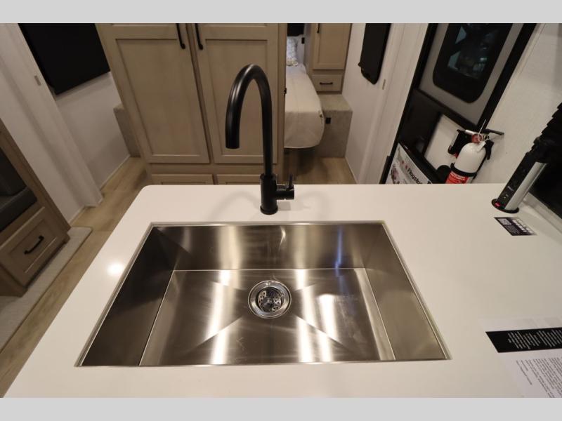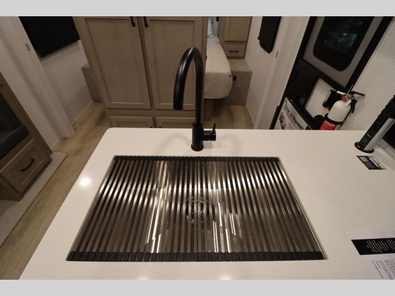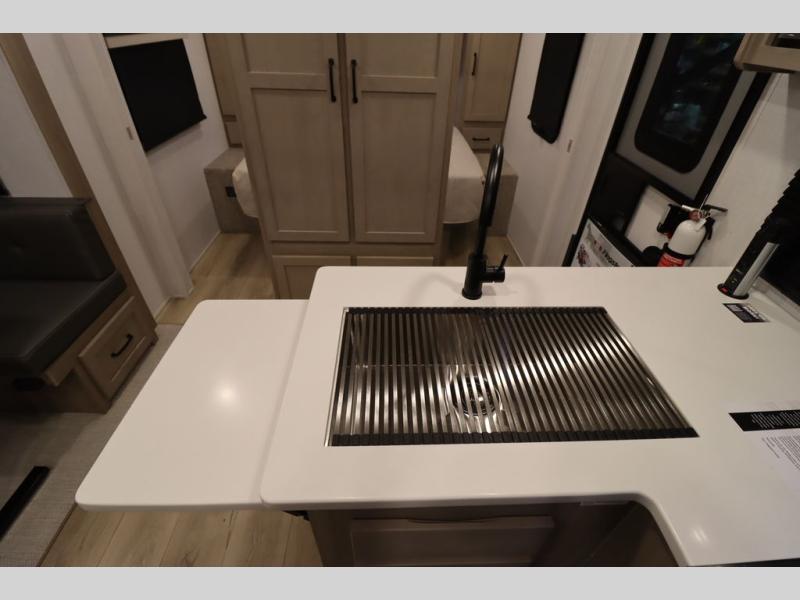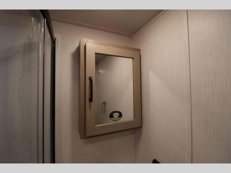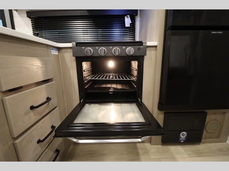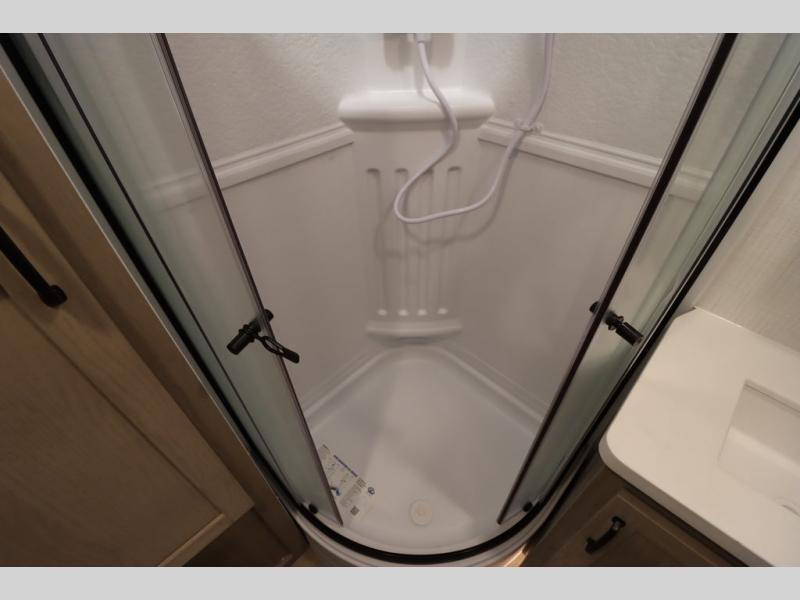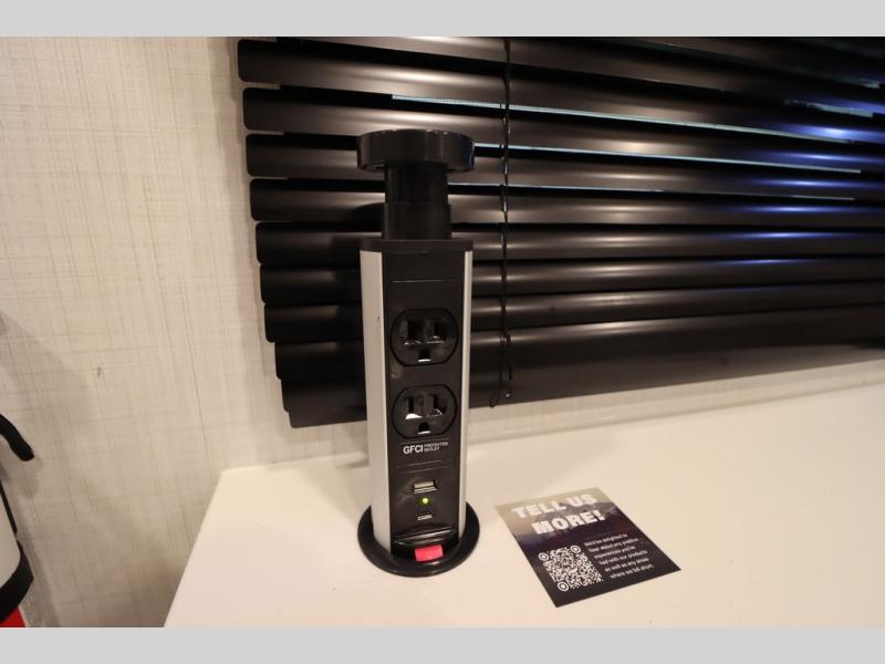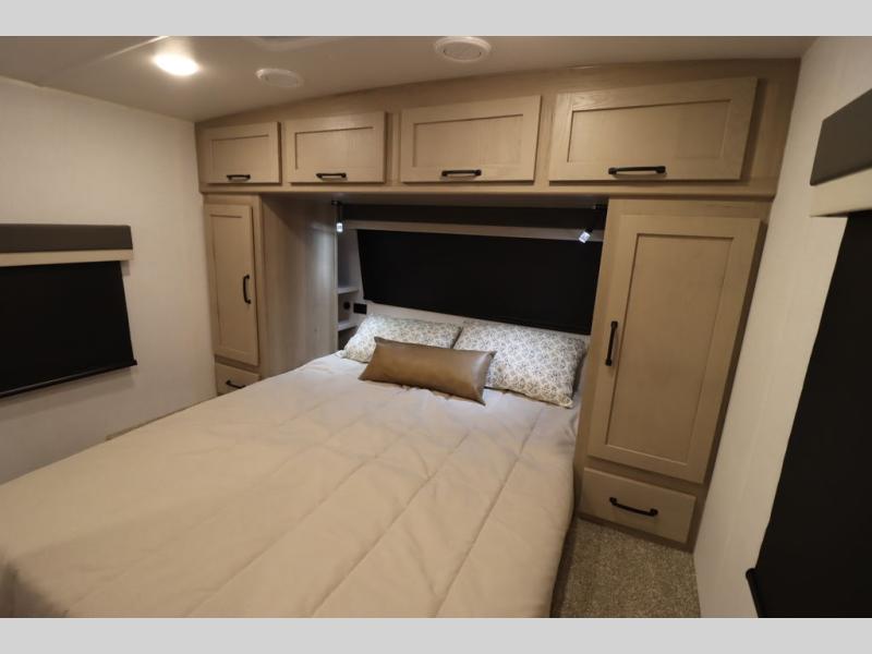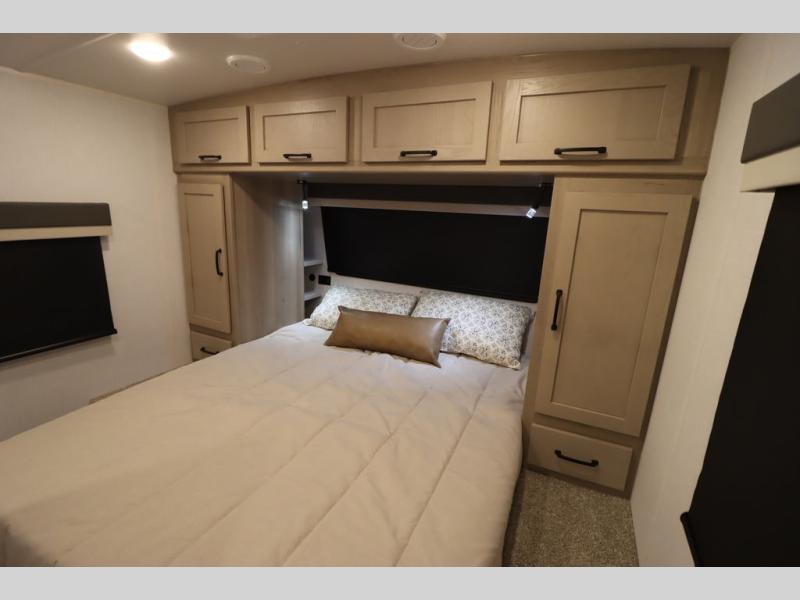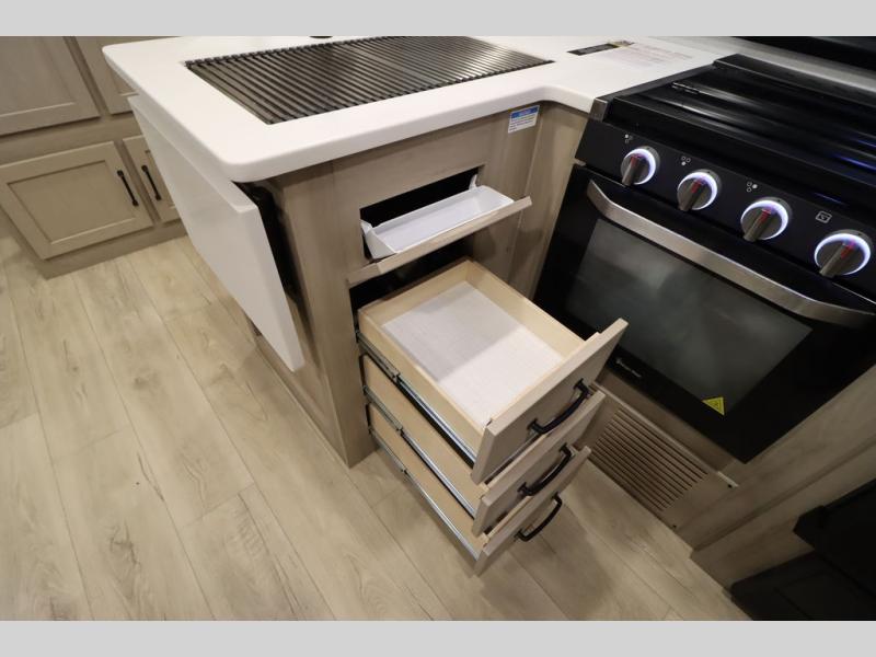 Camping in this single slide out travel trailer will make weekends at the campground comfy and hassle-free! Once you arrive, you can unload the pass-through storage, put out the 18' power awning, then make lunch on the exterior griddle. There is also a full interior kitchen to make meals when the weather isn't cooperating. Everyone can gather around the U-shaped dinette slide for meal times or game night, and there is a spacious pantry where you can store snacks! The bunk beds include a flip-up bottom bunk and an exterior bike door so you can easily pack camp gear away, and the full bath is right next to the bunks for easy nighttime use. Head up front to enjoy your own private bedroom with an RV queen bed, dual wardrobes, and flip-up storage!