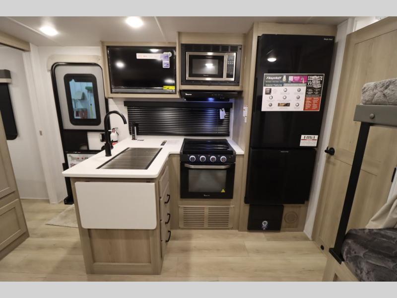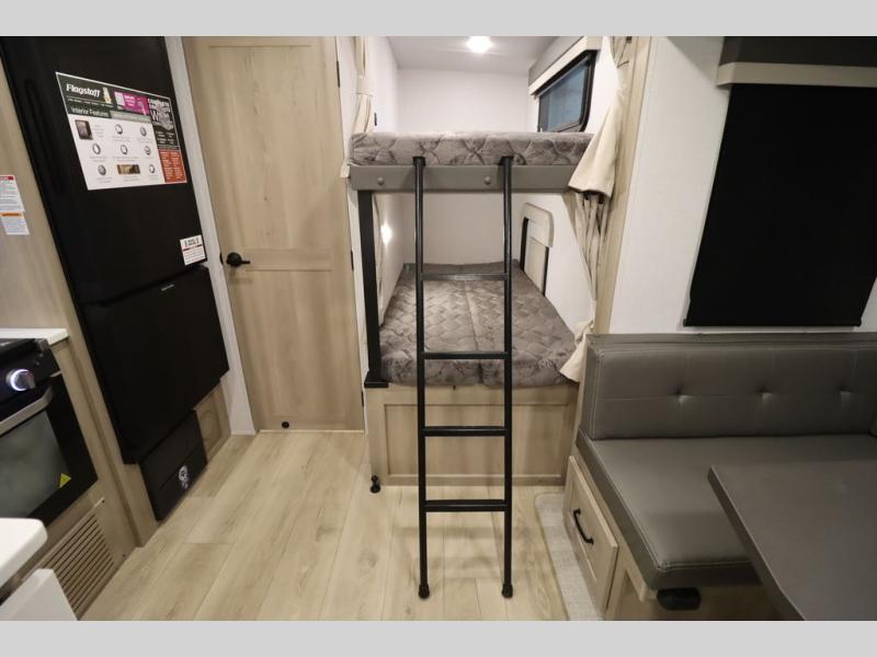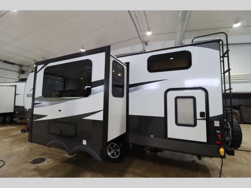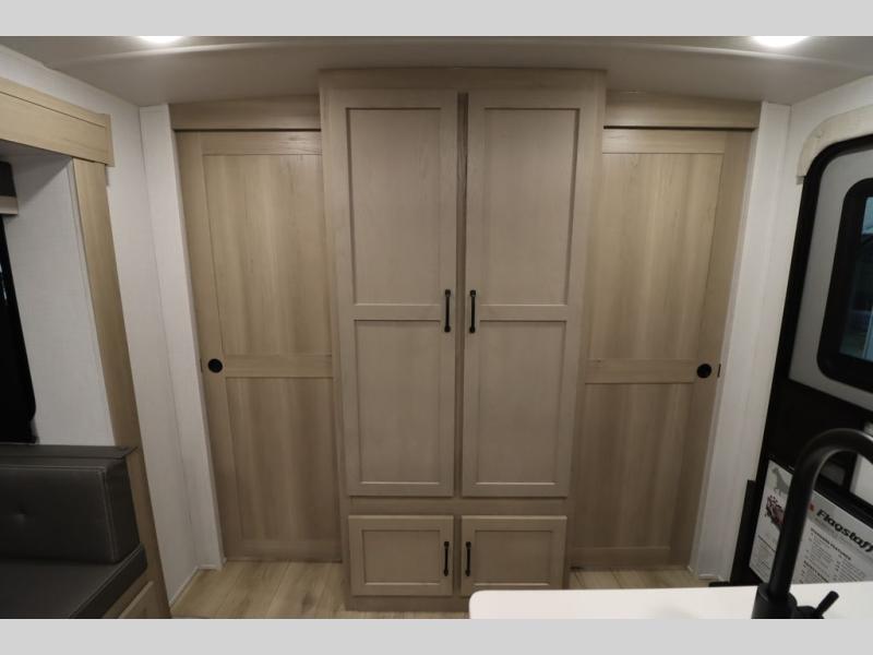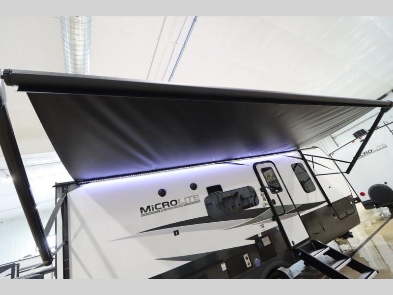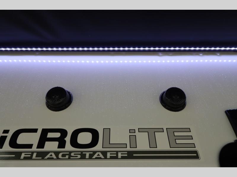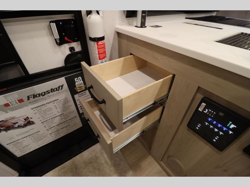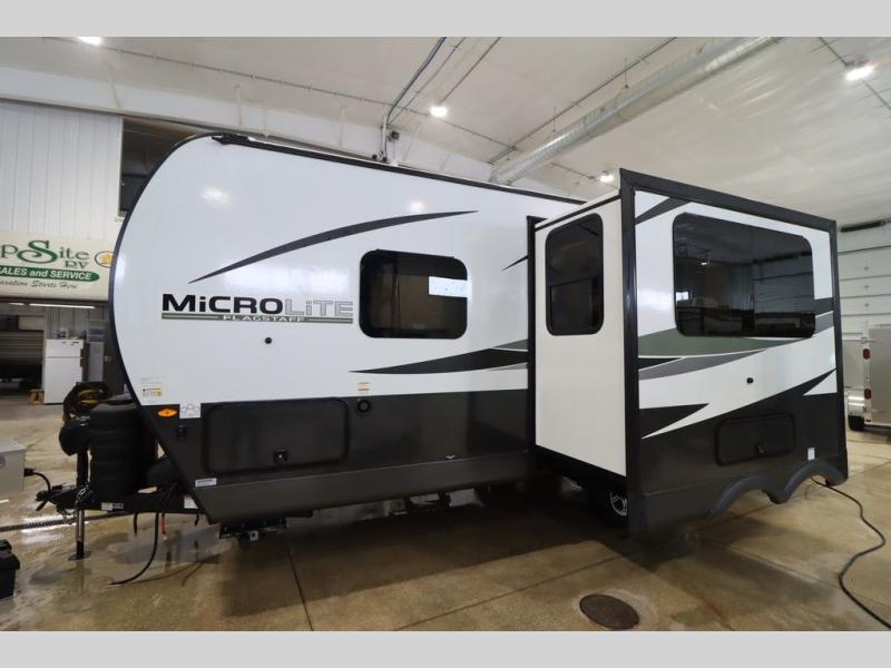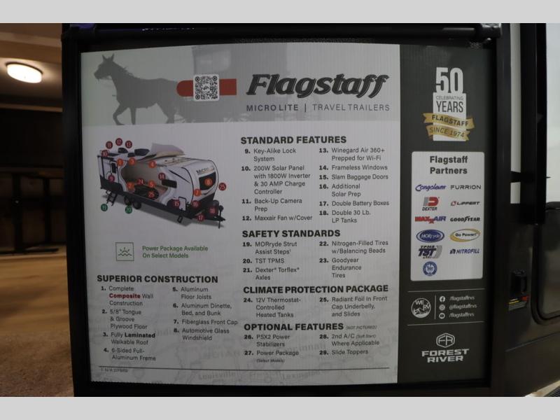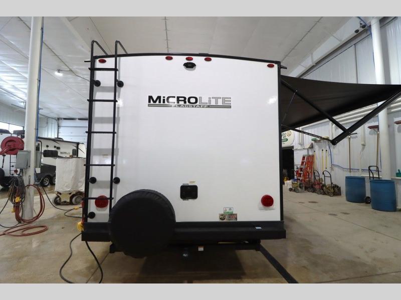 With any Flagstaff Micro Lite travel trailer by Forest River you will enjoy lightweight towing, durable construction, and added interior comforts to make each trip memorable! Each model features a torsion axle, Rubber-Ryde suspension, nitrogen filled, Goodyear Endurance tires, and easy lube axles with Nev-R-Adjust brakes for smooth towing from home to campground. The 6-sided aluminum framed construction provides a strong foundation so you can enjoy your RV for years to come, plus electronically controlled heated holding tanks and an enclosed underbelly will let you camp all year long. Head inside to find hybrid woven flooring in the slide outs, Sedona wood cabinetry, solid surface kitchen countertops, and many more amenities. These travel trailers also include exterior conveniences for hassle-free camping, like the power tongue jack, magnetic compartment door catches, Keyed Alike locks, and rear ladder to name a few!