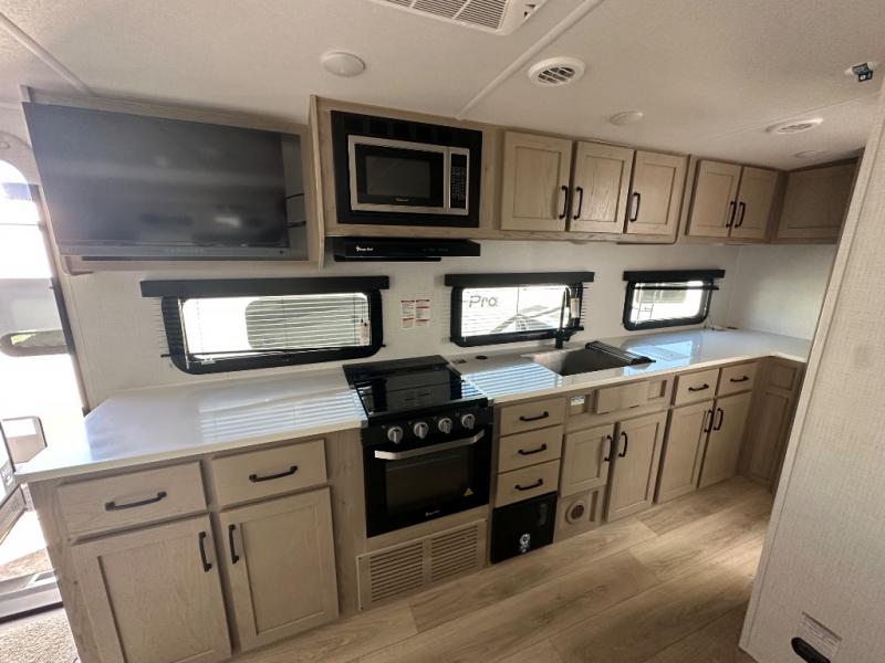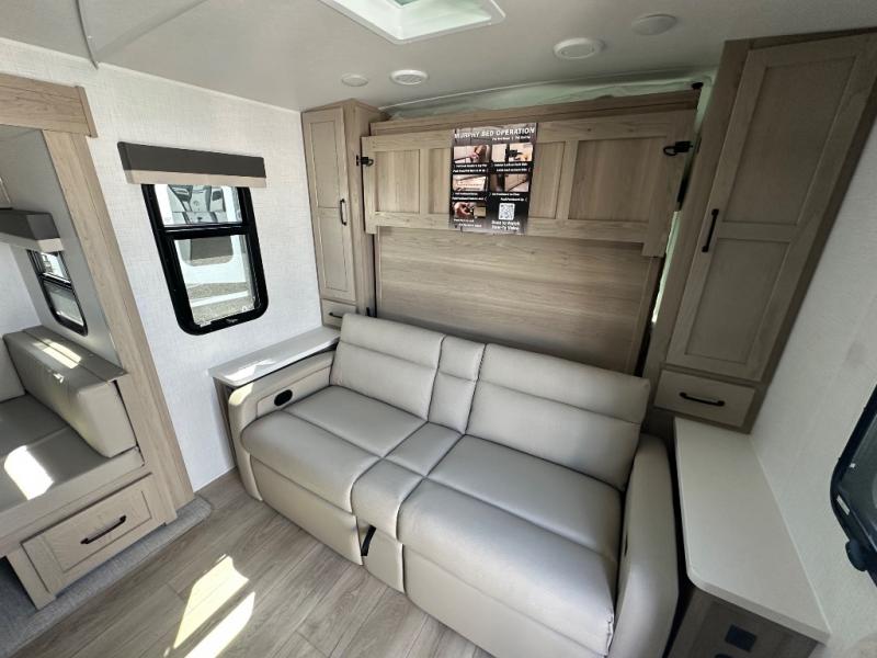 Not only does this travel trailer include an exterior pull out stove and an exterior griddle, but also a full interior kitchen in the back corner! You will appreciate ample counter space inside to prep kabobs for dinner or set out appetizers to keep your campers happy. Up front, you'll find the 74" sofa where you can relax each day, then fold down the Murphy bed in the evening for a great night's rest. There is also a privacy curtain here if you have guests staying over on the U-shaped dinette within the slide out, and the 32" TV means you all can watch a movie at night.