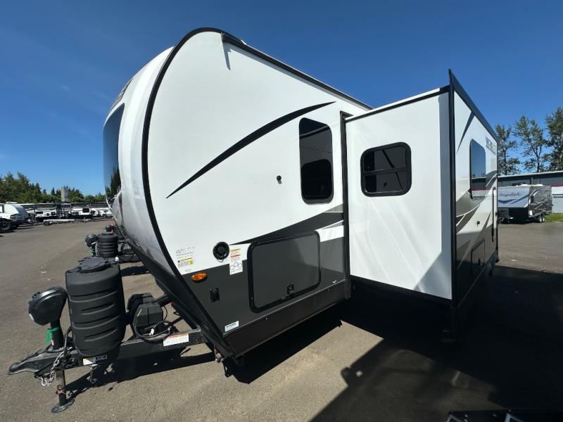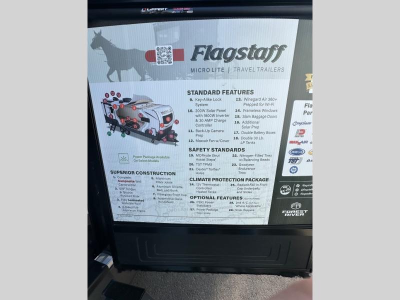 With any Flagstaff Micro Lite travel trailer by Forest River you will enjoy lightweight towing, durable construction, and added interior comforts to make each trip memorable! Each model features a torsion axle, Rubber-Ryde suspension, nitrogen filled, Goodyear Endurance tires, and easy lube axles with Nev-R-Adjust brakes for smooth towing from home to campground. The 6-sided aluminum framed construction provides a strong foundation so you can enjoy your RV for years to come, plus electronically controlled heated holding tanks and an enclosed underbelly will let you camp all year long. Head inside to find hybrid woven flooring in the slide outs, Sedona wood cabinetry, solid surface kitchen countertops, and many more amenities. These travel trailers also include exterior conveniences for hassle-free camping, like the power tongue jack, magnetic compartment door catches, Keyed Alike locks, and rear ladder to name a few!