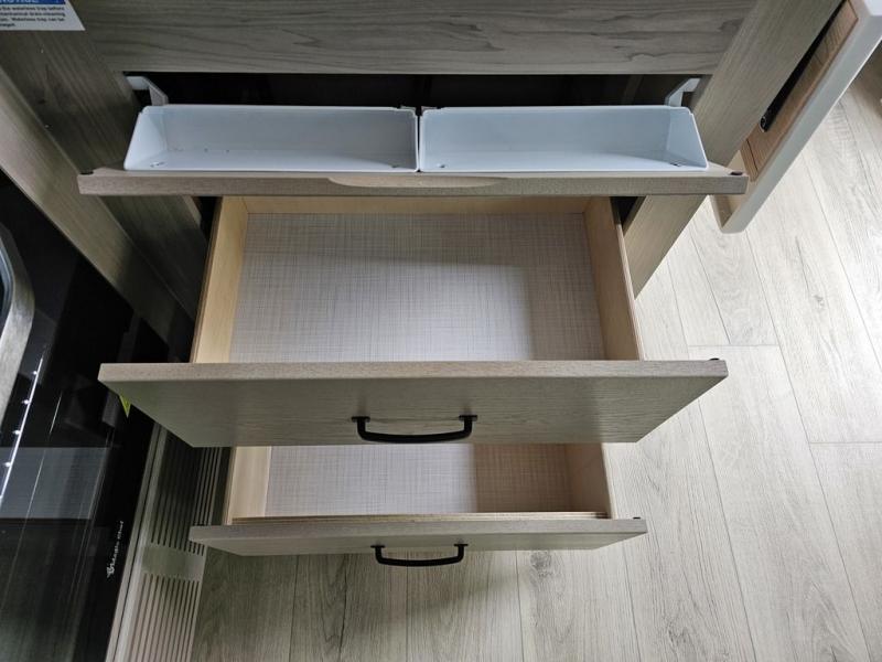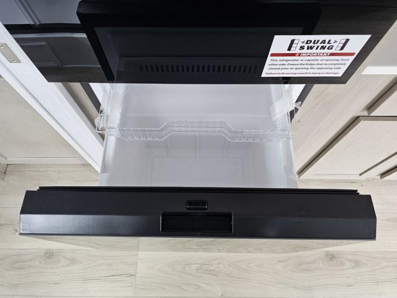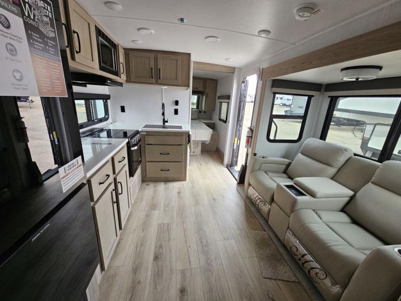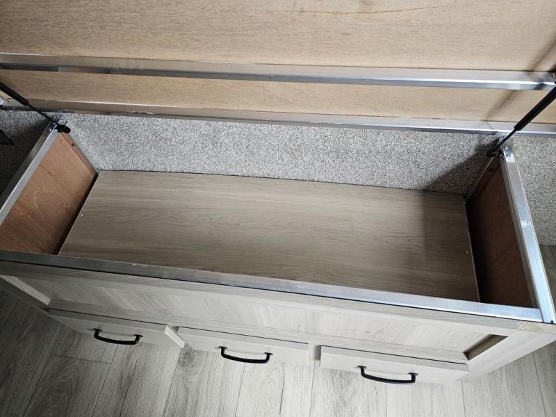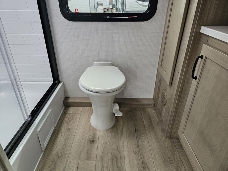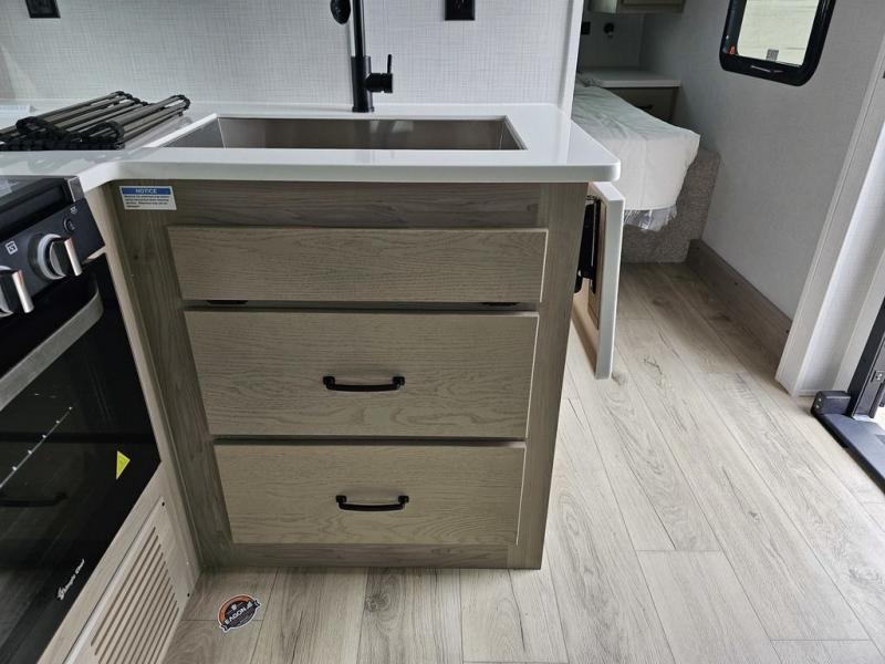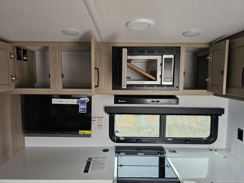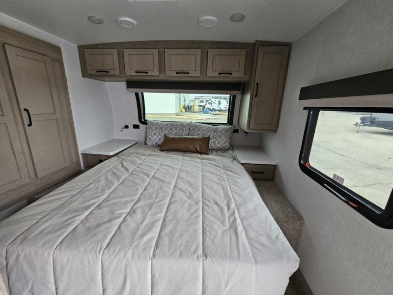 If you like to camp with your honey or a friend, this travel trailer will be perfect for you! You can sleep two people each night on the RV queen bed in the front private bedroom. You'll also find a wardrobe slide in the bedroom for more space, plus an additional wardrobe and an optional TV if you enjoy movies in bed. The theater seat with tables will provide a place to relax and dine together, and if you do need extra sleeping space, just choose the optional hide-a-bed sofa with a table instead of the theater seat. Delicious meals can be made on the three burner cooktop or in the 21" gas oven, and there is a 12V refrigerator for leftovers. The exterior is just as accommodating as the interior with its exterior griddle, drop-frame pass-through storage, 2" receiver hitch, and 20' power awning with LED lights.