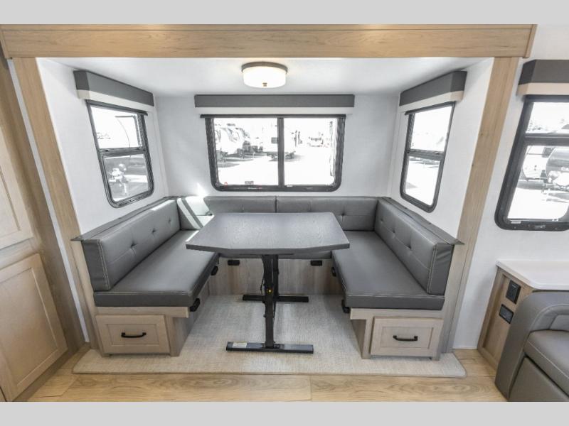 Camping in this double slide out travel trailer will make weekends at the campground comfy and hassle-free! Once you arrive, you can unload the pass-through storage, put out the 18' power awning, then make lunch on the exterior griddle. There is also a full interior kitchen to make meals when the weather isn't cooperating. Everyone can gather around the U-shaped dinette slide for meal times or game night, and there is a spacious pantry where you can store snacks! Within the bunkhouse you'll find a dream dinette and a flip-up bunk, plus a TV option if you want to add entertainment. And you're sure to appreciate the front 74" sofa with a Murphy bed, dual wardrobes, and a privacy curtain!