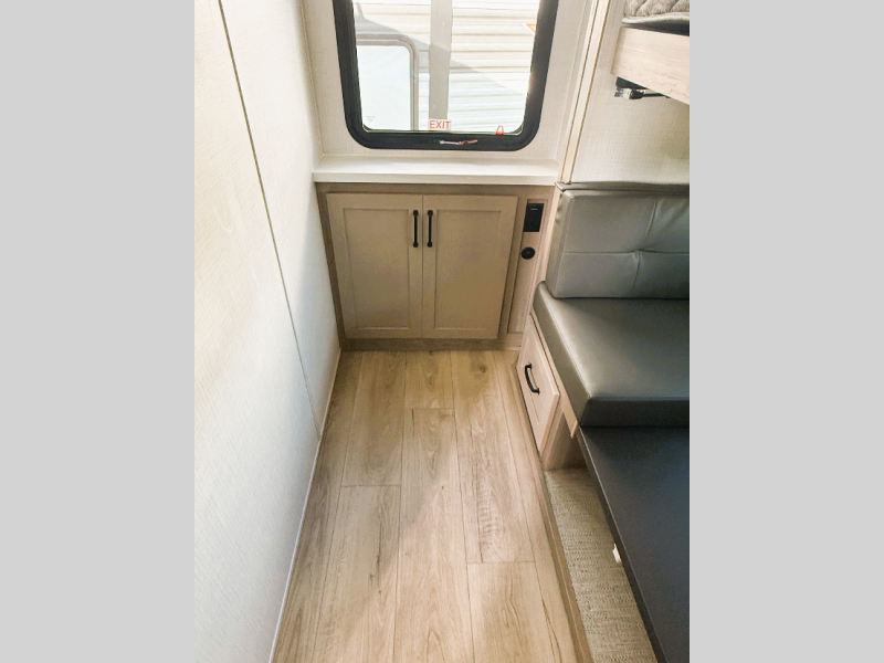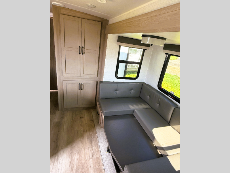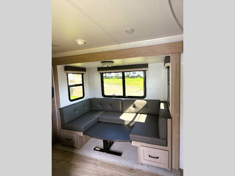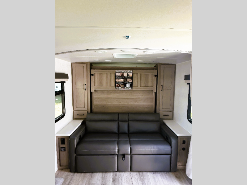 Camping in this double slide out travel trailer will make weekends at the campground comfy and hassle-free! Once you arrive, you can unload the pass-through storage, put out the 18' power awning, then make lunch on the exterior griddle. There is also a full interior kitchen to make meals when the weather isn't cooperating. Everyone can gather around the U-shaped dinette slide for meal times or game night, and there is a spacious pantry where you can store snacks! Within the bunkhouse you'll find a dream dinette and a flip-up bunk, plus a TV option if you want to add entertainment. And you're sure to appreciate the front 74" sofa with a Murphy bed, dual wardrobes, and a privacy curtain!