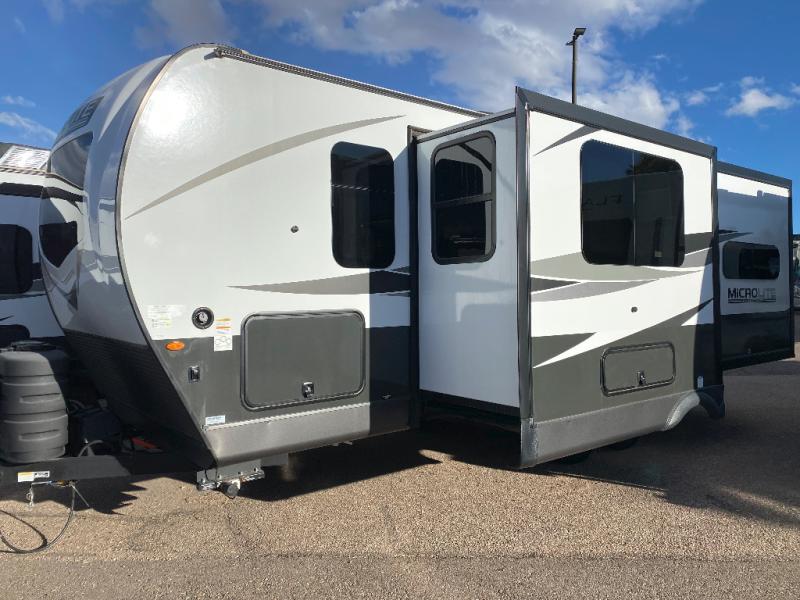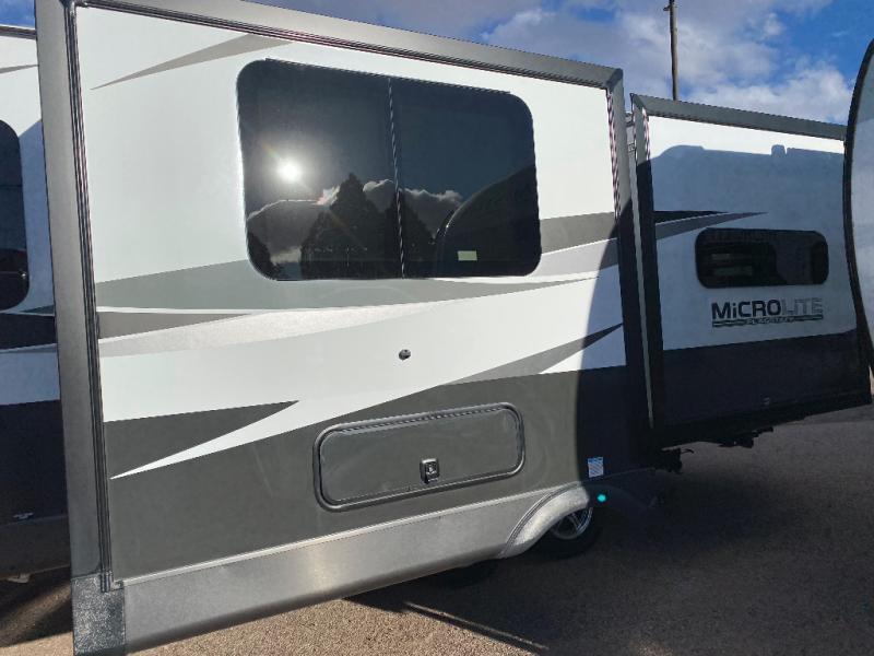 With any Flagstaff Micro Lite travel trailer by Forest River you will enjoy lightweight towing, durable construction, and added interior comforts to make each trip memorable! Each model features a torsion axle, Rubber-Ryde suspension, nitrogen filled, Goodyear Endurance tires, and easy lube axles with Nev-R-Adjust brakes for smooth towing from home to campground. The 6-sided aluminum framed construction provides a strong foundation so you can enjoy your RV for years to come, plus electronically controlled heated holding tanks and an enclosed underbelly will let you camp all year long. Head inside to find hybrid woven flooring in the slide outs, Sedona wood cabinetry, solid surface kitchen countertops, and many more amenities. These travel trailers also include exterior conveniences for hassle-free camping, like the power tongue jack, magnetic compartment door catches, Keyed Alike locks, and rear ladder to name a few!