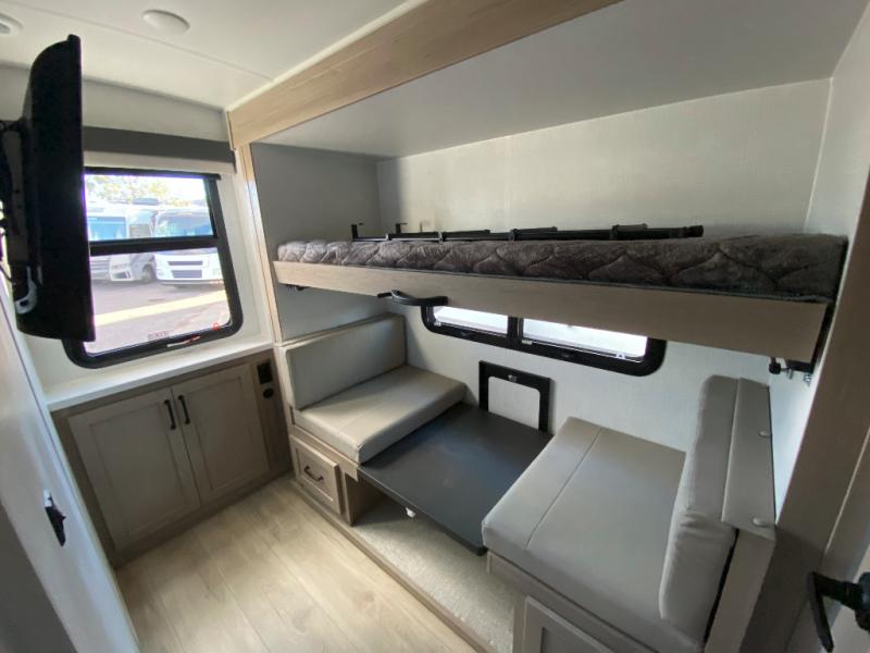 Camping in this double slide out travel trailer will make weekends at the campground comfy and hassle-free! Once you arrive, you can unload the pass-through storage, put out the 18' power awning, then make lunch on the exterior griddle. There is also a full interior kitchen to make meals when the weather isn't cooperating. Everyone can gather around the U-shaped dinette slide for meal times or game night, and there is a spacious pantry where you can store snacks! Within the bunkhouse you'll find a dream dinette and a flip-up bunk, plus a TV option if you want to add entertainment. And you're sure to appreciate the front 74" sofa with a Murphy bed, dual wardrobes, and a privacy curtain!