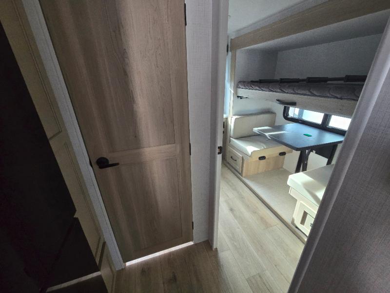 Camping in this double slide out travel trailer will make weekends at the campground comfy and hassle-free! Once you arrive, you can unload the pass-through storage, put out the 18' power awning, then make lunch on the exterior griddle. There is also a full interior kitchen to make meals when the weather isn't cooperating. Everyone can gather around the U-shaped dinette slide for meal times or game night, and there is a spacious pantry where you can store snacks! Within the bunkhouse you'll find a dream dinette and a flip-up bunk, plus a TV option if you want to add entertainment. And you're sure to appreciate the front 74" sofa with a Murphy bed, dual wardrobes, and a privacy curtain!