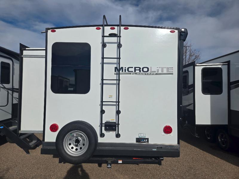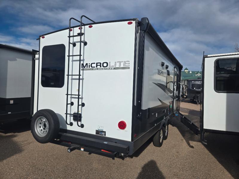 With any Flagstaff Micro Lite travel trailer by Forest River you will enjoy lightweight towing, durable construction, and added interior comforts to make each trip memorable! Each model features a torsion axle, Rubber-Ryde suspension, nitrogen filled, Goodyear Endurance tires, and easy lube axles with Nev-R-Adjust brakes for smooth towing from home to campground. The 6-sided aluminum framed construction provides a strong foundation so you can enjoy your RV for years to come, plus electronically controlled heated holding tanks and an enclosed underbelly will let you camp all year long. Head inside to find hybrid woven flooring in the slide outs, Sedona wood cabinetry, solid surface kitchen countertops, and many more amenities. These travel trailers also include exterior conveniences for hassle-free camping, like the power tongue jack, magnetic compartment door catches, Keyed Alike locks, and rear ladder to name a few!