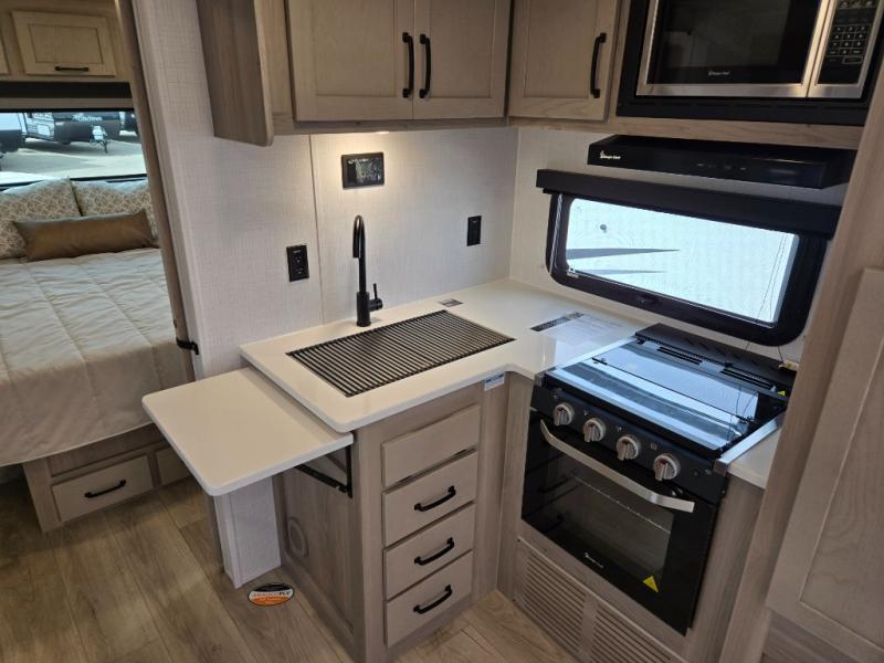 With any Flagstaff Micro Lite travel trailer by Forest River you will enjoy lightweight towing, durable construction, and added interior comforts to make each trip memorable! Each model features a torsion axle, Rubber-Ryde suspension, nitrogen filled, Goodyear Endurance tires, and easy lube axles with Nev-R-Adjust brakes for smooth towing from home to campground. The 6-sided aluminum framed construction provides a strong foundation so you can enjoy your RV for years to come, plus electronically controlled heated holding tanks and an enclosed underbelly will let you camp all year long. Head inside to find hybrid woven flooring in the slide outs, Sedona wood cabinetry, solid surface kitchen countertops, and many more amenities. These travel trailers also include exterior conveniences for hassle-free camping, like the power tongue jack, magnetic compartment door catches, Keyed Alike locks, and rear ladder to name a few!