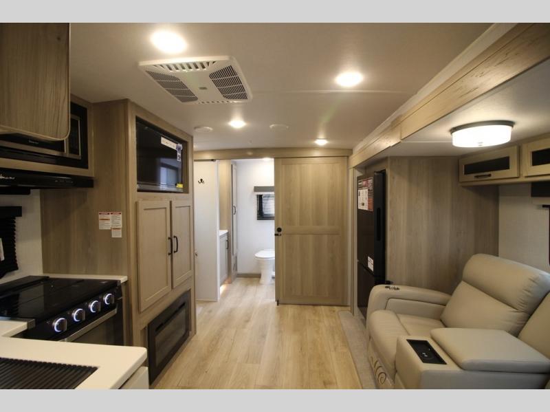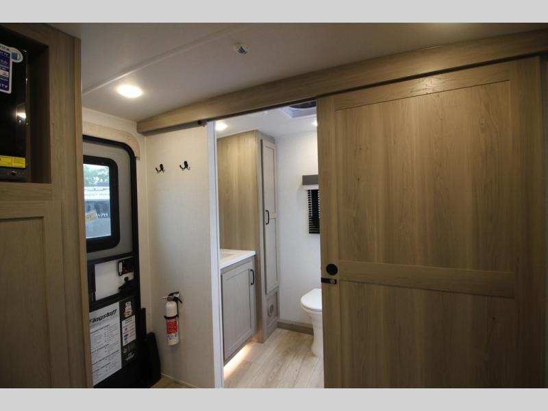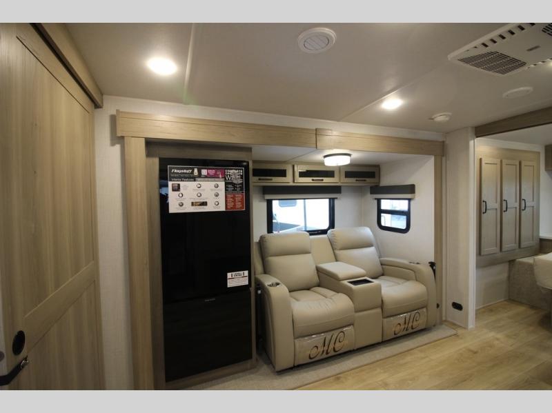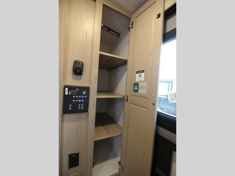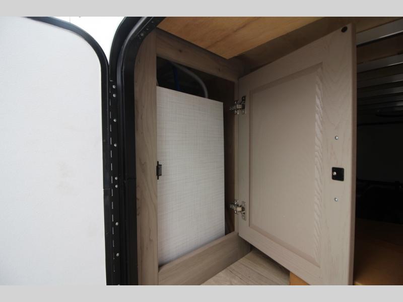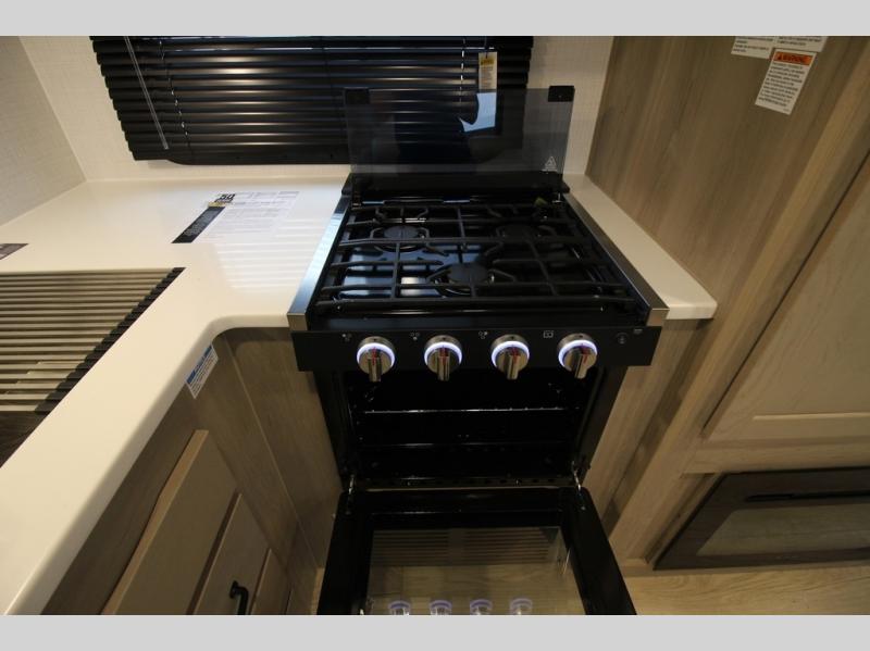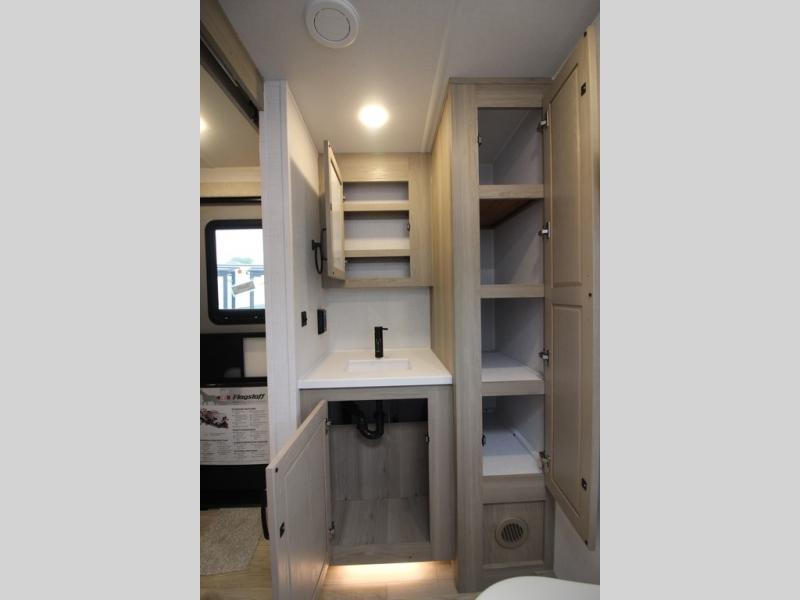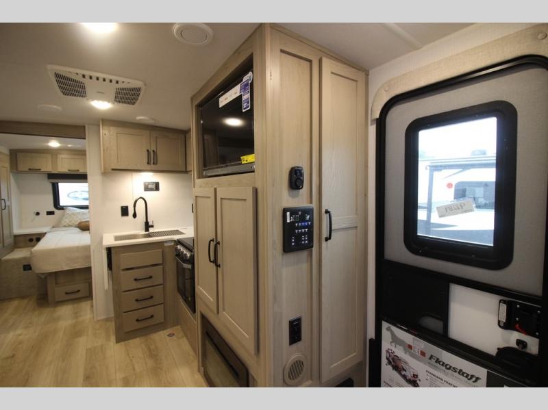For the couple who enjoys a weekend camping trip, come choose this Flagstaff Micro Lite travel trailer. This unit features a slide that holds the theater seats with tables where you can dine each day, or you can choose the optional booth dinette or optional hide-a-bed sofa if you need more sleeping space. You'll love relaxing on these in the evening while you enjoy your entertainment center with an 32" 12V Smart entertainment TV. The private front bedroom includes an RV queen bed and a wardrobe slide. You'll love the cute kitchen with extra counter space for meal prep and a large closet/pantry to hold your favorite snacks.