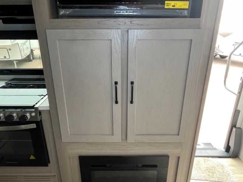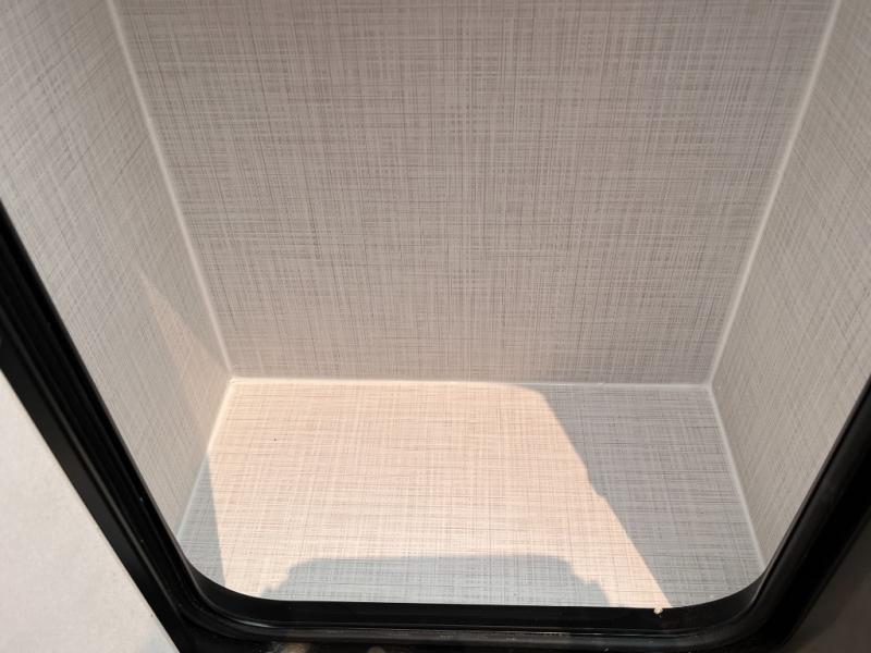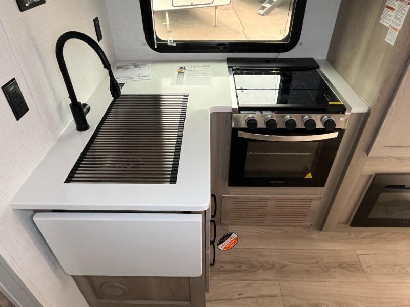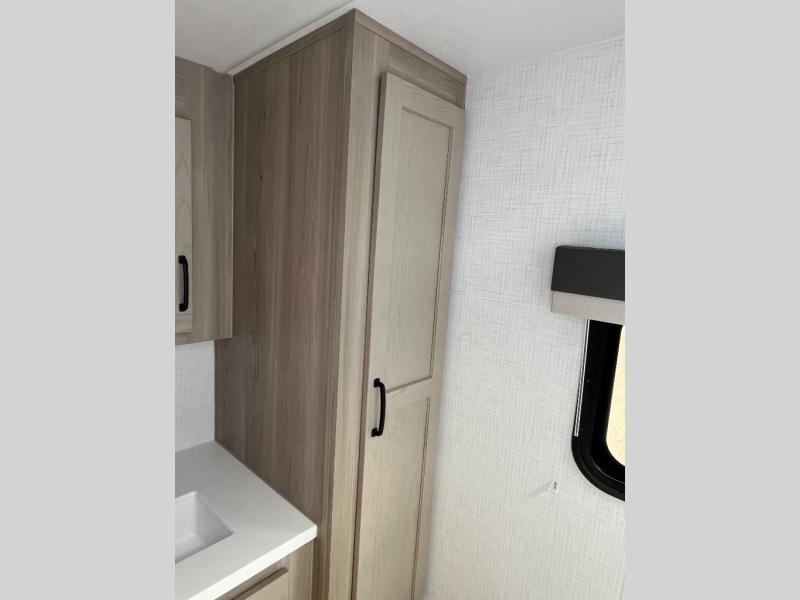 For the couple who enjoys a weekend camping trip, come choose this Flagstaff Micro Lite travel trailer. This unit features a slide that holds the theater seats with tables where you can dine each day, or you can choose the optional booth dinette or optional hide-a-bed sofa if you need more sleeping space. You'll love relaxing on these in the evening while you enjoy your entertainment center with an 32" 12V Smart entertainment TV. The private front bedroom includes an RV queen bed and a wardrobe slide. You'll love the cute kitchen with extra counter space for meal prep and a large closet/pantry to hold your favorite snacks.