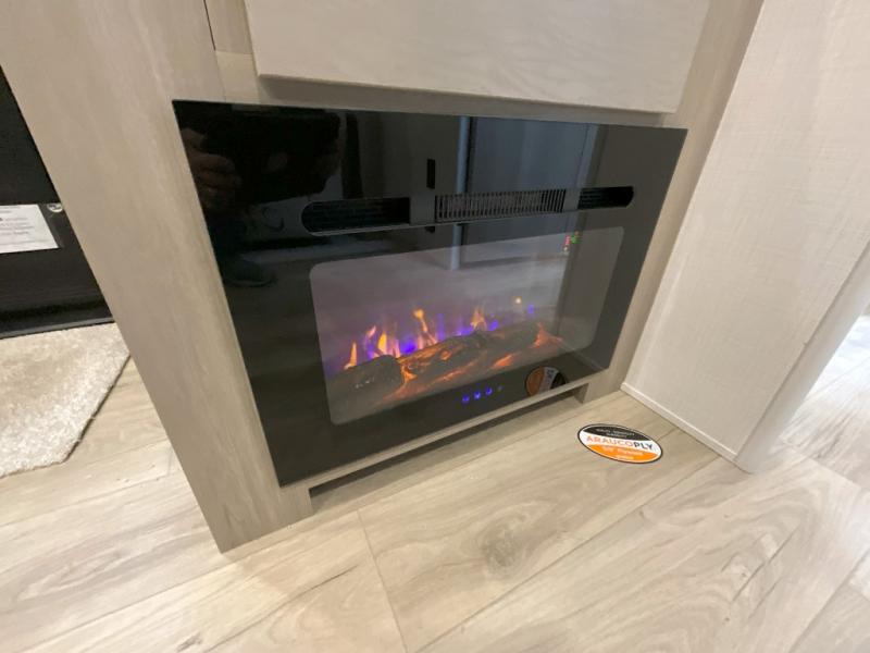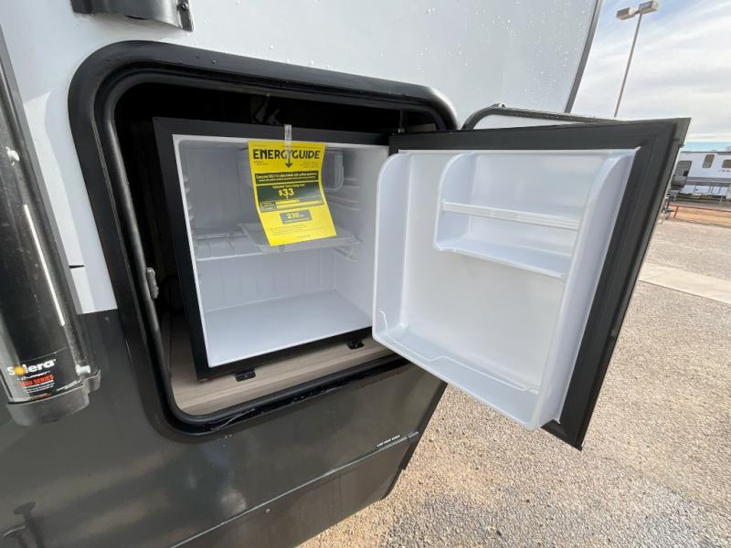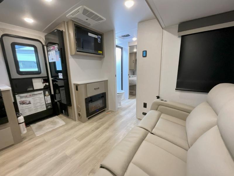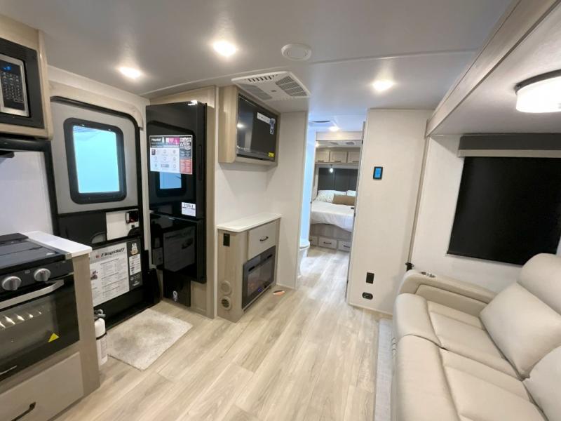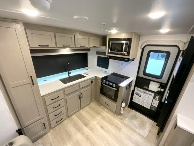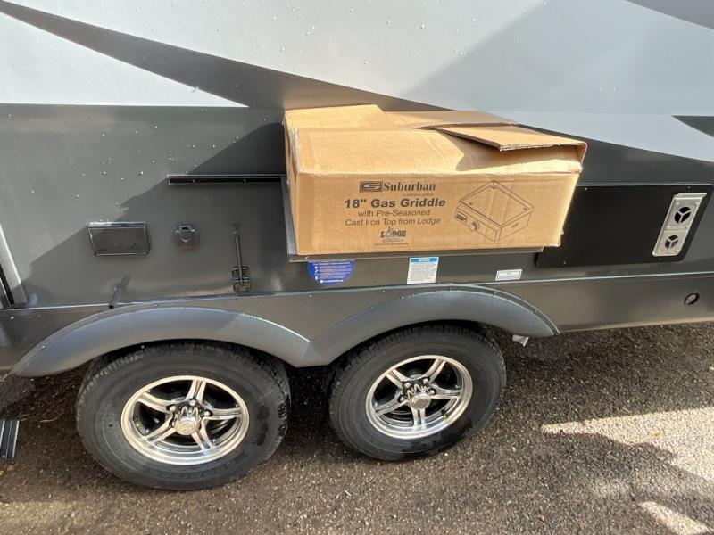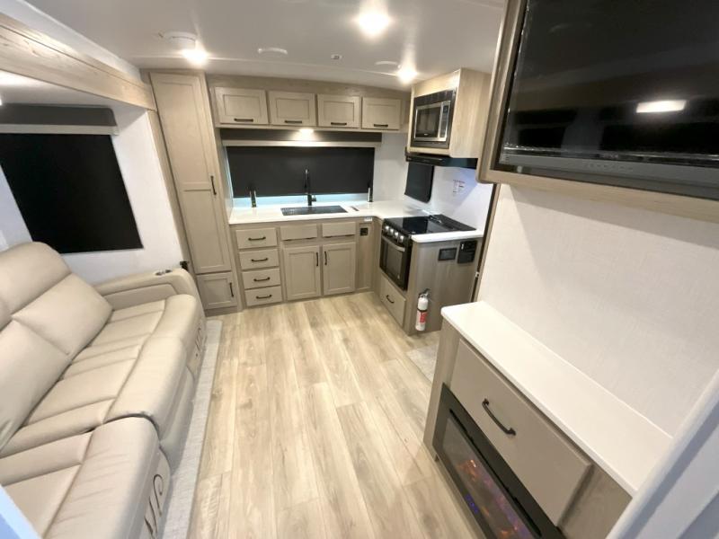With dual entry doors and a front kitchen with generous counter space, this trailer is perfect for weekends at the campground! When you don't feel like cooking indoors, there is an exterior griddle and a 19' power awning to give you some shade. A U-shaped dinette slides provides more floor space inside, and it's in great view of the TV and fireplace. You'll find that the walk-thru bath is easily accessible, and the rear master bedroom will feel just like home with its RV queen bed and flip-up storage!