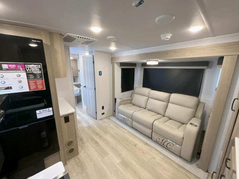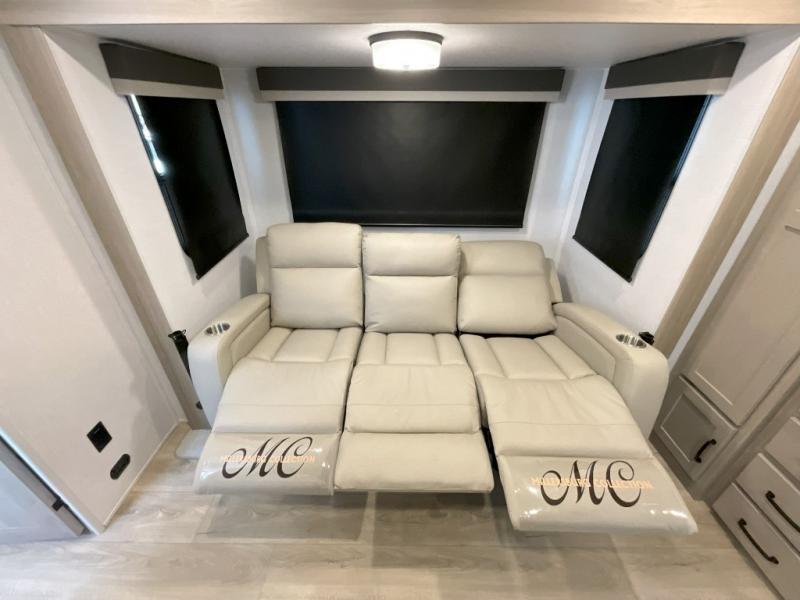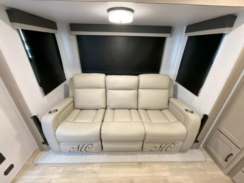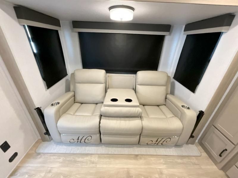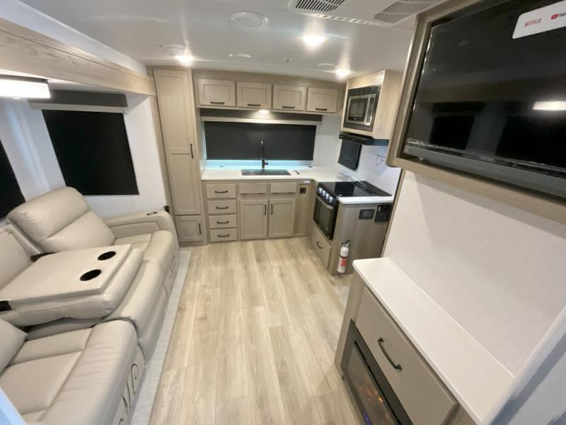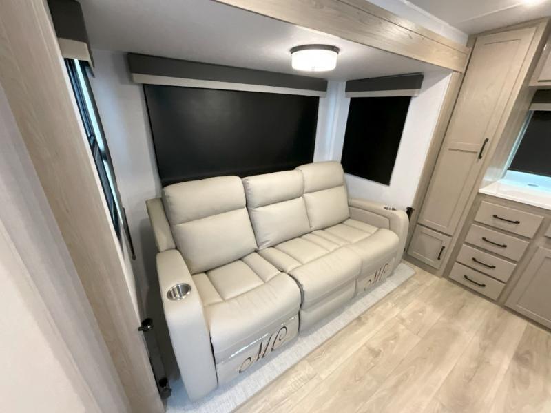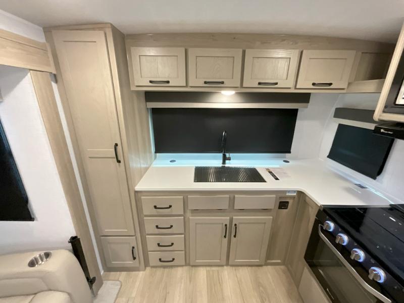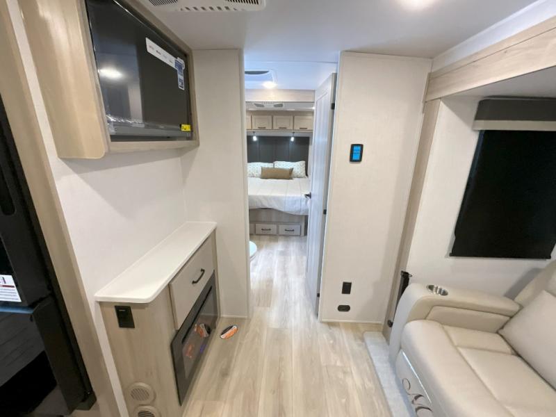 With dual entry doors and a front kitchen with generous counter space, this trailer is perfect for weekends at the campground! When you don't feel like cooking indoors, there is an exterior griddle and a 19' power awning to give you some shade. A U-shaped dinette slides provides more floor space inside, and it's in great view of the TV and fireplace. You'll find that the walk-thru bath is easily accessible, and the rear master bedroom will feel just like home with its RV queen bed and flip-up storage!