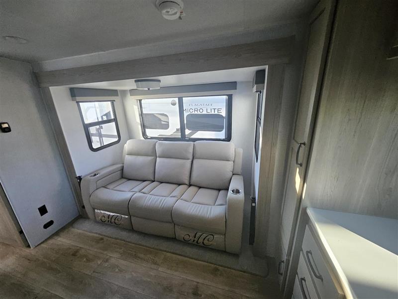 With any Flagstaff Micro Lite travel trailer by Forest River you will enjoy lightweight towing, durable construction, and added interior comforts to make each trip memorable! Each model features a torsion axle, Rubber-Ryde suspension, nitrogen filled, Goodyear Endurance tires, and easy lube axles with Nev-R-Adjust brakes for smooth towing from home to campground. The 6-sided aluminum framed construction provides a strong foundation so you can enjoy your RV for years to come, plus electronically controlled heated holding tanks and an enclosed underbelly will let you camp all year long. Head inside to find hybrid woven flooring in the slide outs, Sedona wood cabinetry, solid surface kitchen countertops, and many more amenities. These travel trailers also include exterior conveniences for hassle-free camping, like the power tongue jack, magnetic compartment door catches, Keyed Alike locks, and rear ladder to name a few!