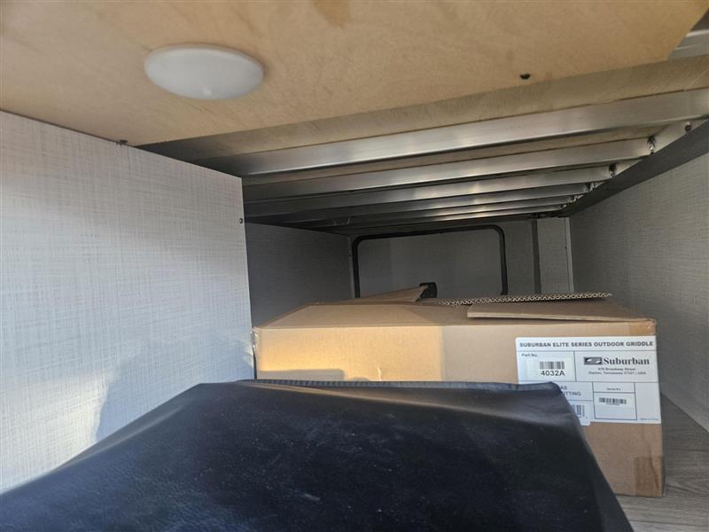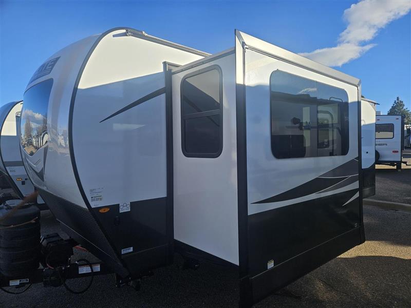 With dual entry doors and a front kitchen with generous counter space, this trailer is perfect for weekends at the campground! When you don't feel like cooking indoors, there is an exterior griddle and a 19' power awning to give you some shade. A U-shaped dinette slides provides more floor space inside, and it's in great view of the TV and fireplace. You'll find that the walk-thru bath is easily accessible, and the rear master bedroom will feel just like home with its RV queen bed and flip-up storage!