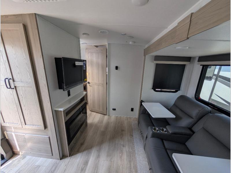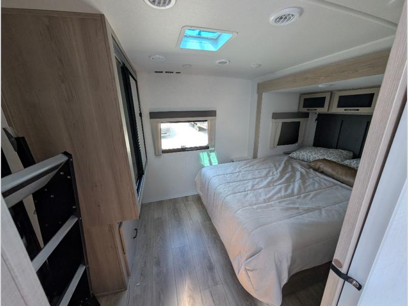This Flagstaff Micro Lite travel trailer is going to make your camping dreams come true! With a queen bed slide and a large wardrobe in the private bedroom, you will have all that you need for sleeping and storing your belongings. Plus, the second exterior entry door leads right into the bedroom so that you can escape for an early morning run without running through the entire trailer to get outside. The front kitchen is open and accommodating with its helpful tools, and the 67" theater seat is right next to the 12V refrigerator on the slide out. Right next to the front entry door is a coat closet/pantry so you can keep your jackets readily available, and there is also a linen closet in the walk-through bath so that you can keep your towels ready for your shower.