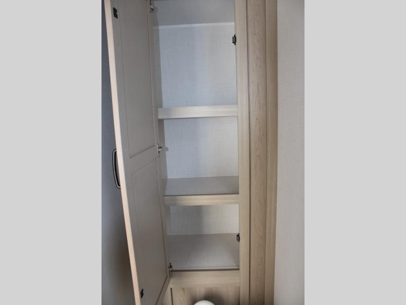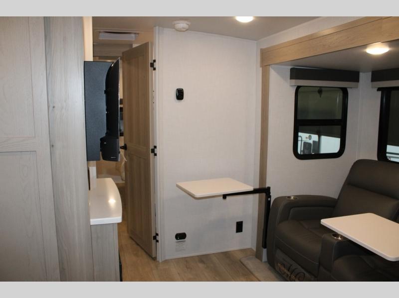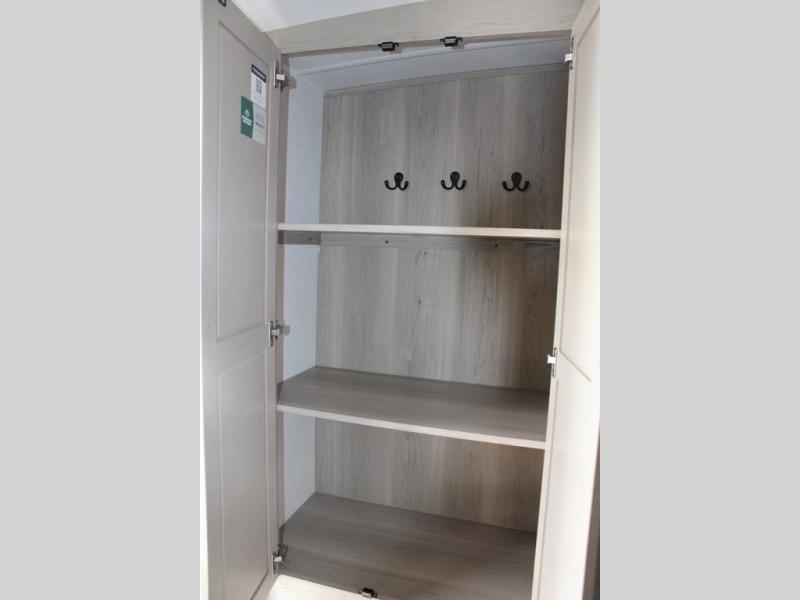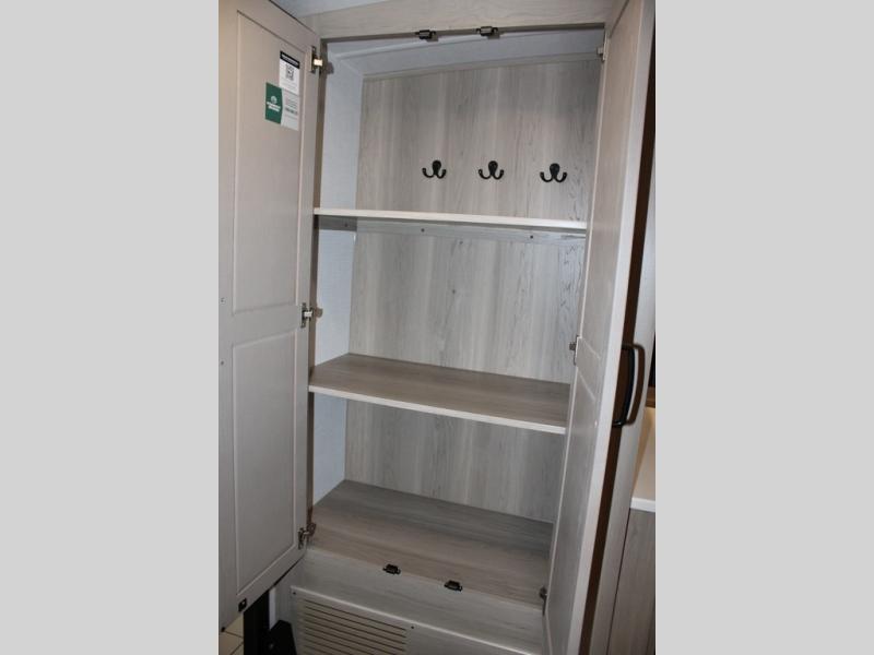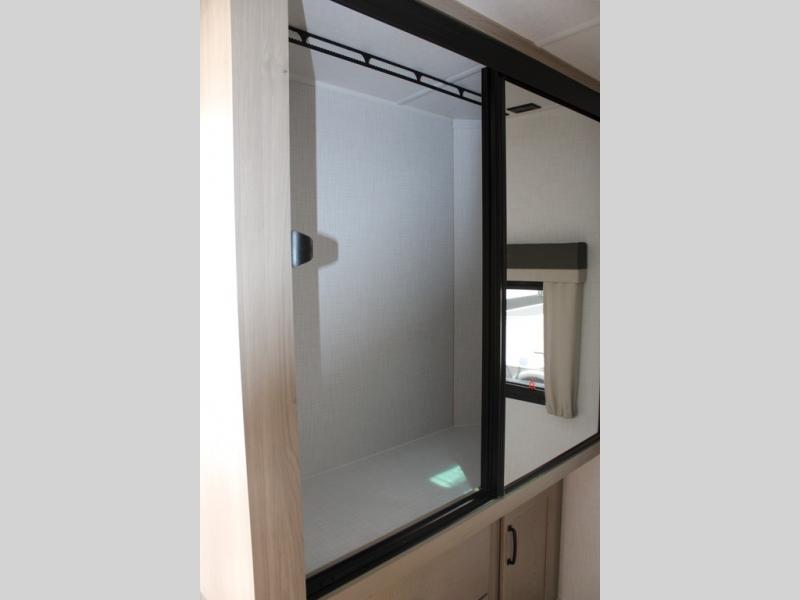 This Flagstaff Micro Lite travel trailer is going to make your camping dreams come true! With a queen bed slide and a large wardrobe in the private bedroom, you will have all that you need for sleeping and storing your belongings. Plus, the second exterior entry door leads right into the bedroom so you can escape for an early morning run without running through the entire trailer to get outside. The front kitchen is open and accommodating with its helpful tools, and the 67" theater seat is right next to the 12V refrigerator on the slide out. Right next to the front entry door is a coat closet/pantry so you can keep your jackets readily available, and there is also a linen closet in the walk-through bath so that you can keep your towels ready for your shower.