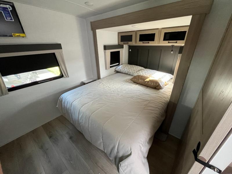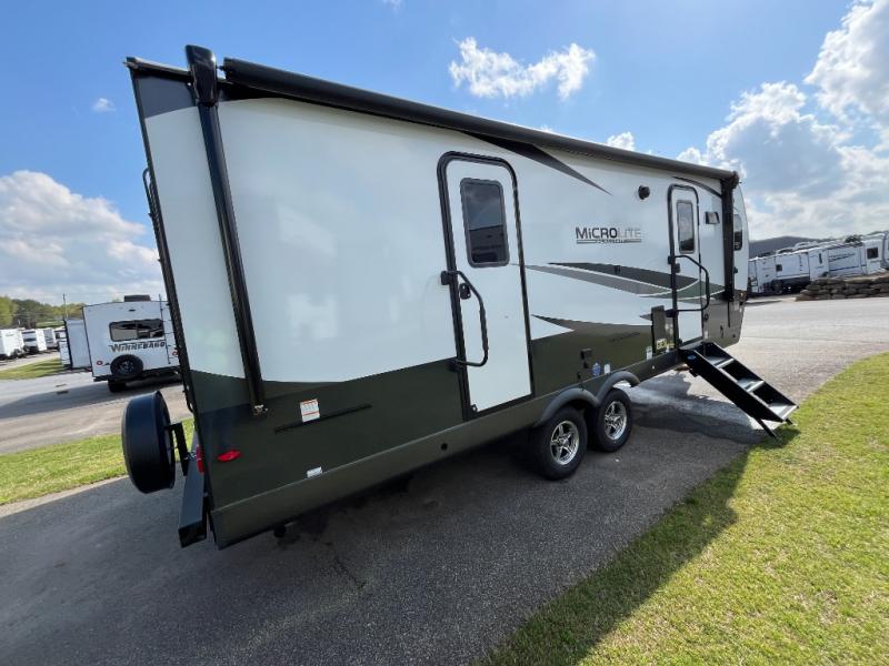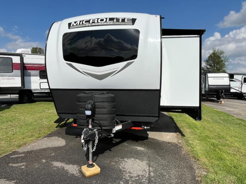 With any Flagstaff Micro Lite travel trailer by Forest River you will enjoy lightweight towing, durable construction, and added interior comforts to make each trip memorable! Each model features a torsion axle, Rubber-Ryde suspension, nitrogen filled, Goodyear Endurance tires, and easy lube axles with Nev-R-Adjust brakes for smooth towing from home to campground. The 6-sided aluminum framed construction provides a strong foundation so you can enjoy your RV for years to come, plus electronically controlled heated holding tanks and an enclosed underbelly will let you camp all year long. Head inside to find hybrid woven flooring in the slide outs, Sedona wood cabinetry, solid surface kitchen countertops, and many more amenities. These travel trailers also include exterior conveniences for hassle-free camping, like the power tongue jack, magnetic compartment door catches, Keyed Alike locks, and rear ladder to name a few!