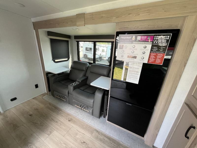 This Flagstaff Micro Lite travel trailer is going to make your camping dreams come true! With a queen bed slide and a large wardrobe in the private bedroom, you will have all that you need for sleeping and storing your belongings. Plus, the second exterior entry door leads right into the bedroom so you can escape for an early morning run without running through the entire trailer to get outside. The front kitchen is open and accommodating with its helpful tools, and the 67" theater seat is right next to the 12V refrigerator on the slide out. Right next to the front entry door is a coat closet/pantry so you can keep your jackets readily available, and there is also a linen closet in the walk-through bath so that you can keep your towels ready for your shower.