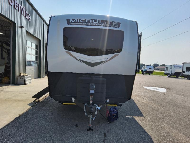 With any Flagstaff Micro Lite travel trailer by Forest River you will enjoy lightweight towing, durable construction, and added interior comforts to make each trip memorable! Each model features a torsion axle, Rubber-Ryde suspension, nitrogen filled, Goodyear Endurance tires, and easy lube axles with Nev-R-Adjust brakes for smooth towing from home to campground. The 6-sided aluminum framed construction provides a strong foundation so you can enjoy your RV for years to come, plus electronically controlled heated holding tanks and an enclosed underbelly will let you camp all year long. Head inside to find hybrid woven flooring in the slide outs, Sedona wood cabinetry, solid surface kitchen countertops, and many more amenities. These travel trailers also include exterior conveniences for hassle-free camping, like the power tongue jack, magnetic compartment door catches, Keyed Alike locks, and rear ladder to name a few!