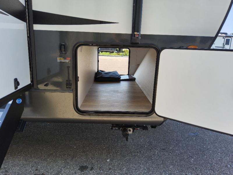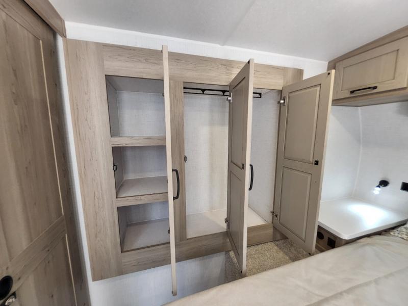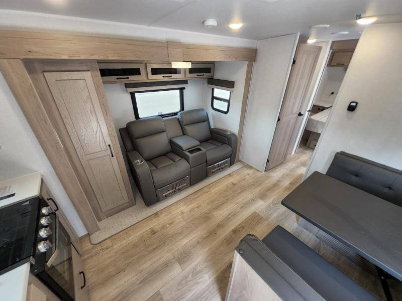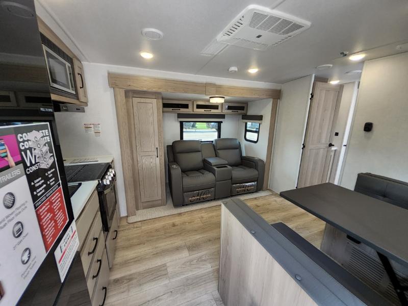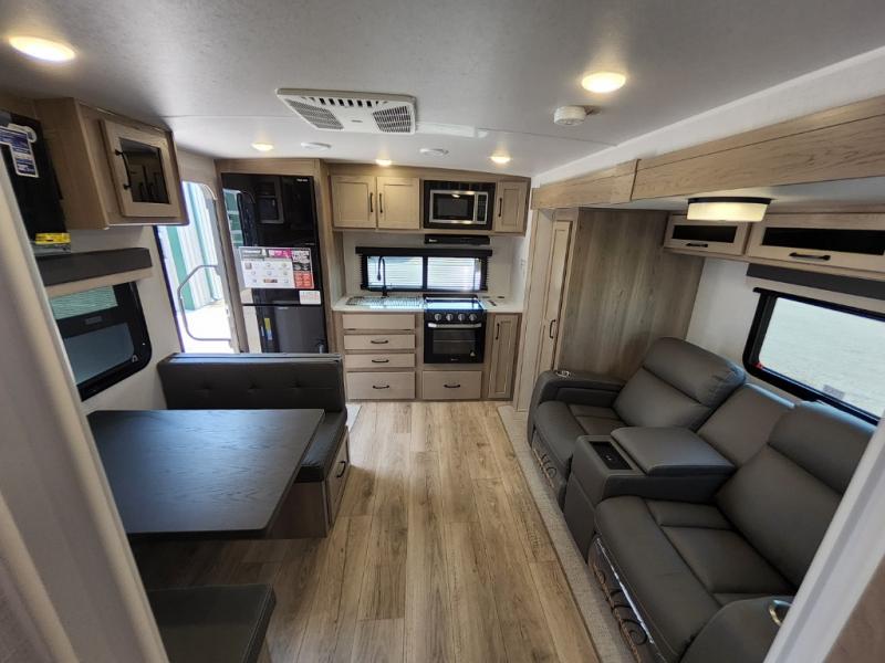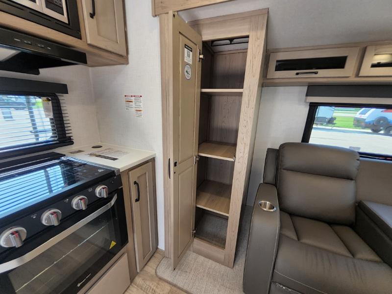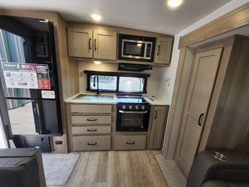 Trips to your favorite campground are made complete with this dual slide out, dual entry trailer! One entry goes straight into the front master bedroom where you'll find an RV queen bed with flip-up storage, a wardrobe slide out, and easy access into the walk-through bath. Once you're through the bath, you'll find the main living area, rear kitchen, and the second entry door at the back. Your crew can play a game at the 39" booth dinette or relax on the theater seat across from the TV. The kitchen includes everything you need to prepare meals in the morning, including a three burner cooktop and microwave oven, plus a 12V refrigerator and a pantry for food storage.