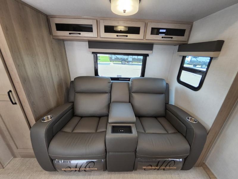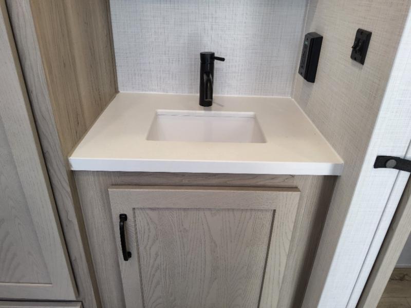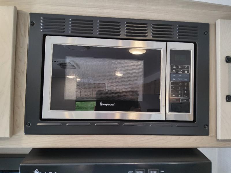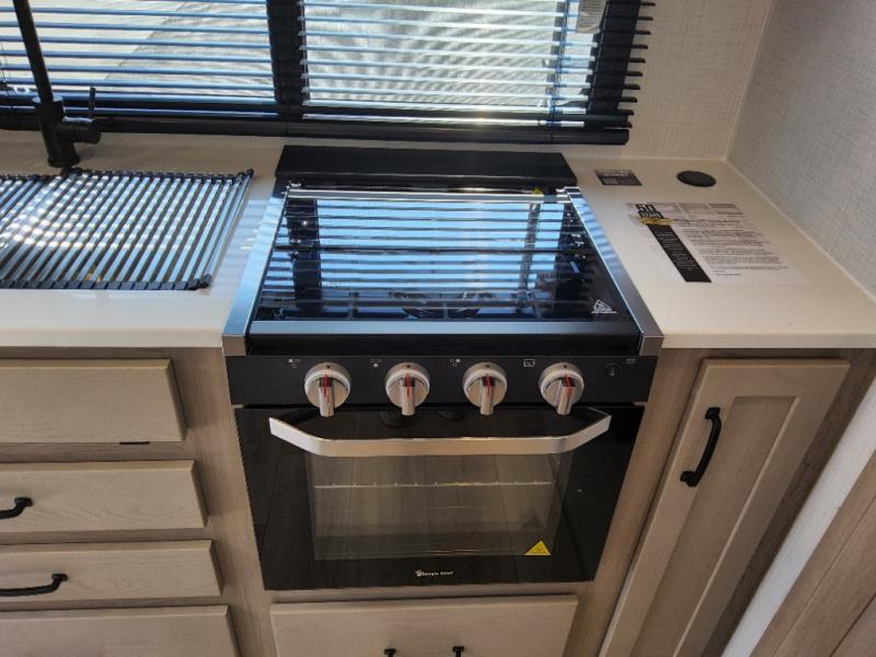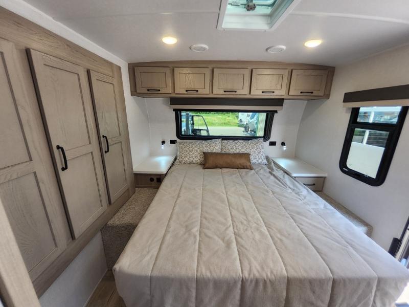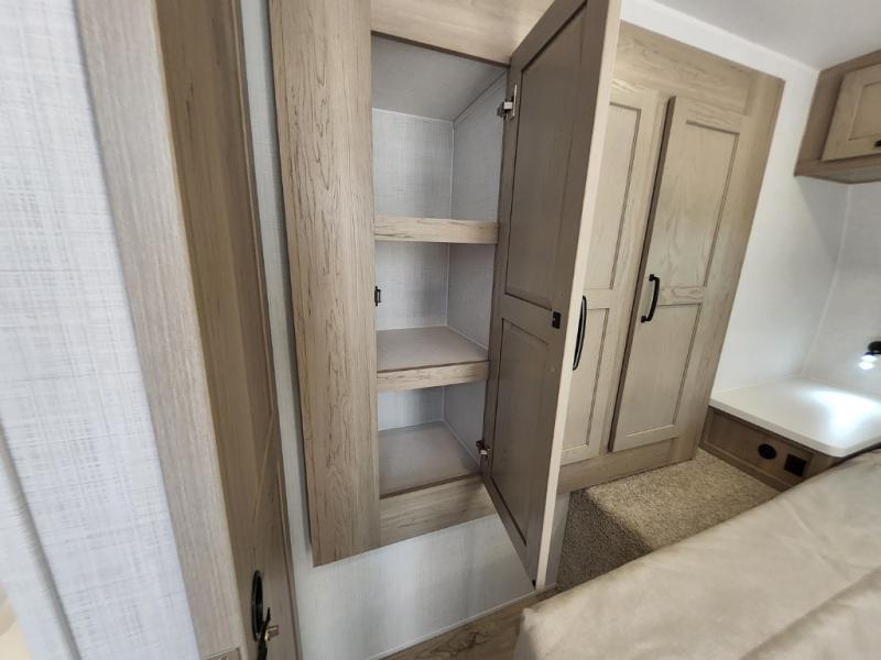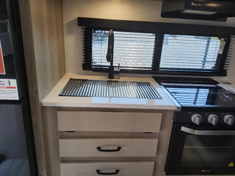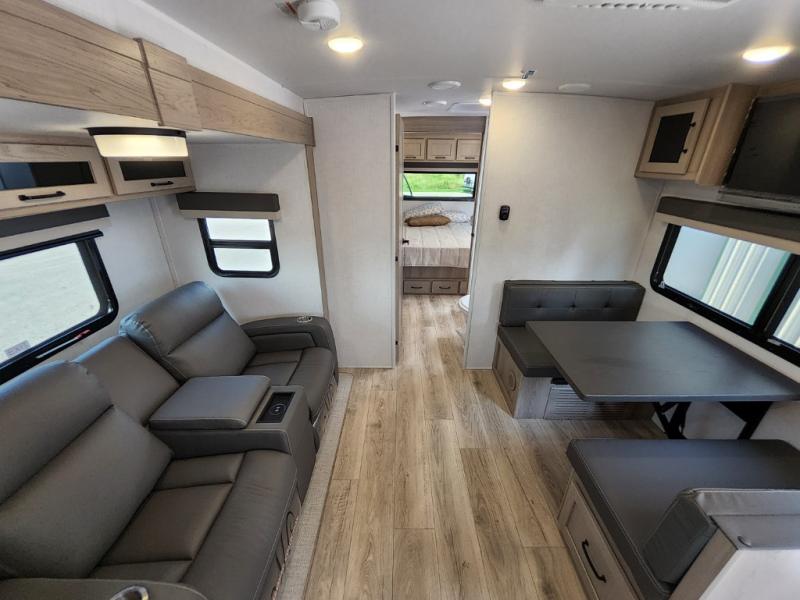 Trips to your favorite campground are made complete with this dual slide out, dual entry trailer! One entry goes straight into the front master bedroom where you'll find an RV queen bed with flip-up storage, a wardrobe slide out, and easy access into the walk-through bath. Once you're through the bath, you'll find the main living area, rear kitchen, and the second entry door at the back. Your crew can play a game at the 39" booth dinette or relax on the theater seat across from the TV. The kitchen includes everything you need to prepare meals in the morning, including a three burner cooktop and microwave oven, plus a 12V refrigerator and a pantry for food storage.