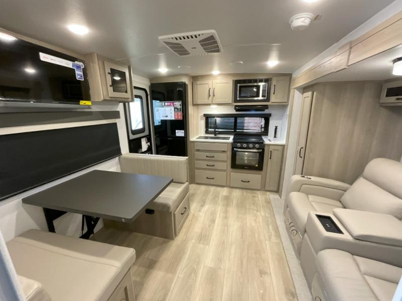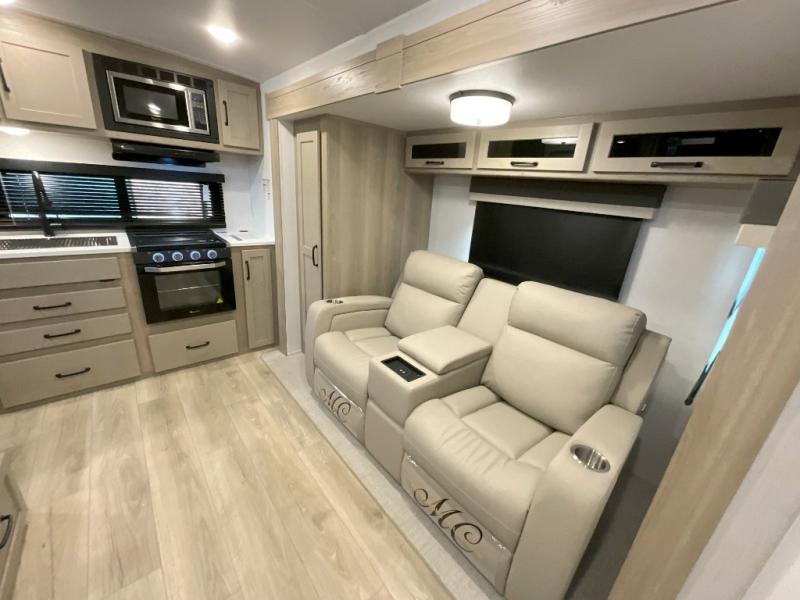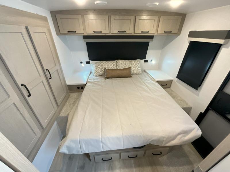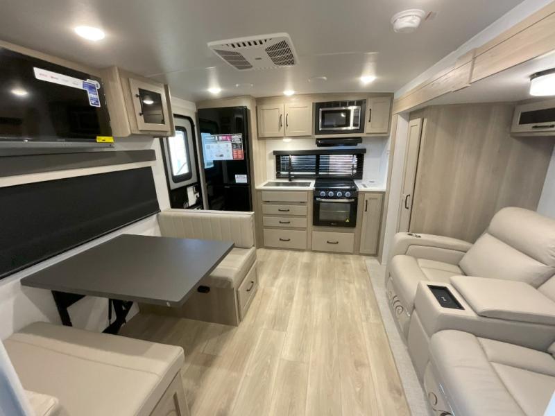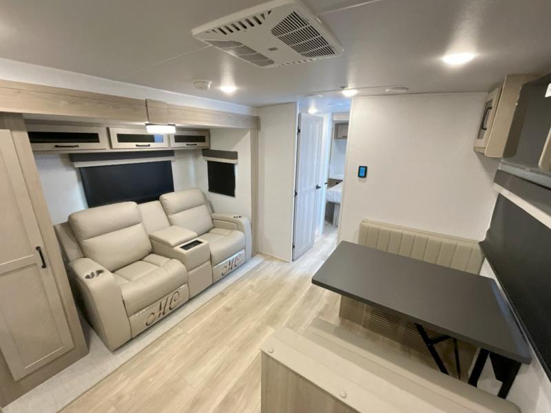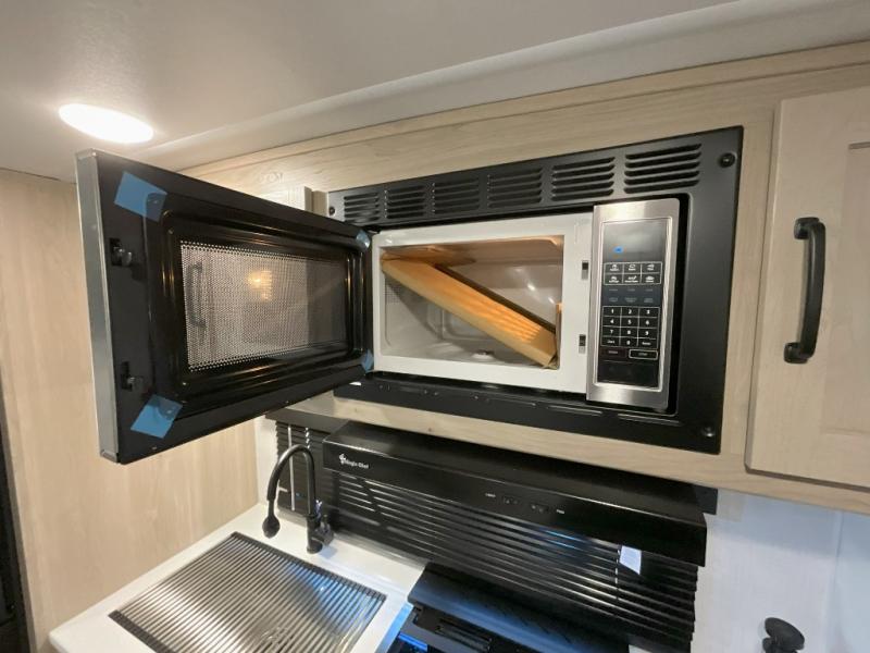 Trips to your favorite campground are made complete with this dual slide out, dual entry trailer! One entry goes straight into the front master bedroom where you'll find an RV queen bed with flip-up storage, a wardrobe slide out, and easy access into the walk-through bath. Once you're through the bath, you'll find the main living area, rear kitchen, and the second entry door at the back. Your crew can play a game at the 39" booth dinette or relax on the theater seat across from the TV. The kitchen includes everything you need to prepare meals in the morning, including a three burner cooktop and microwave oven, plus a 12V refrigerator and a pantry for food storage.