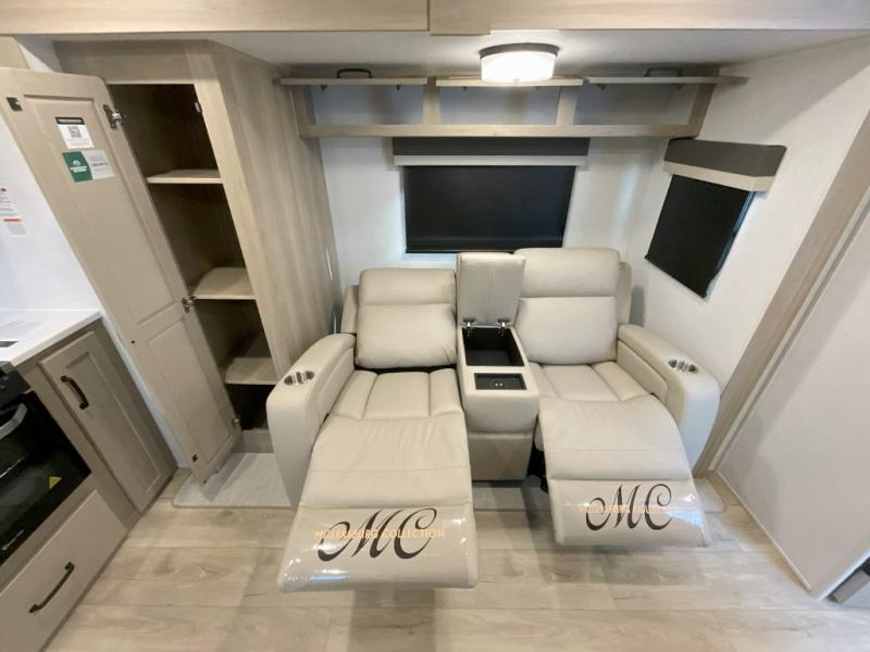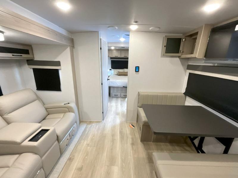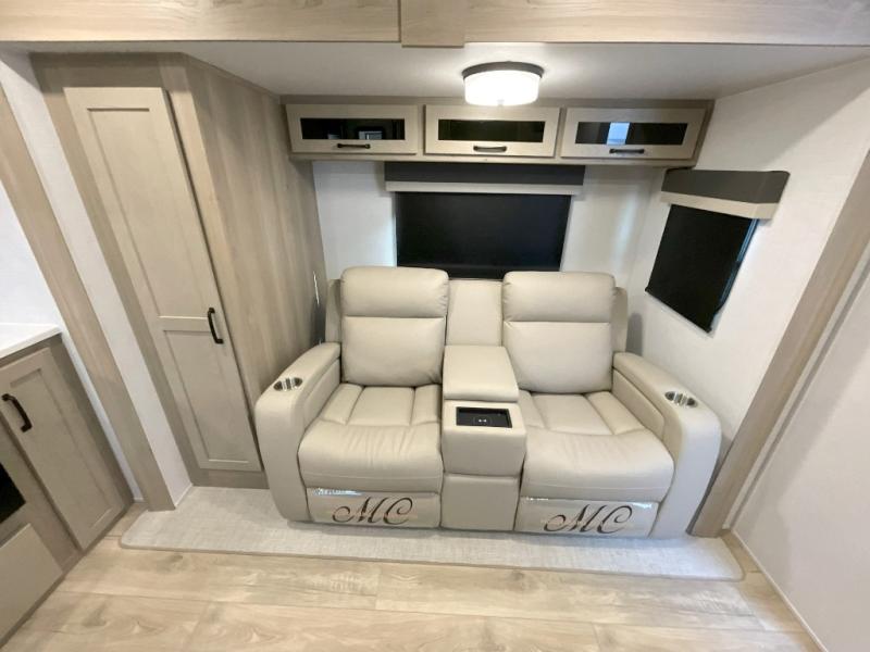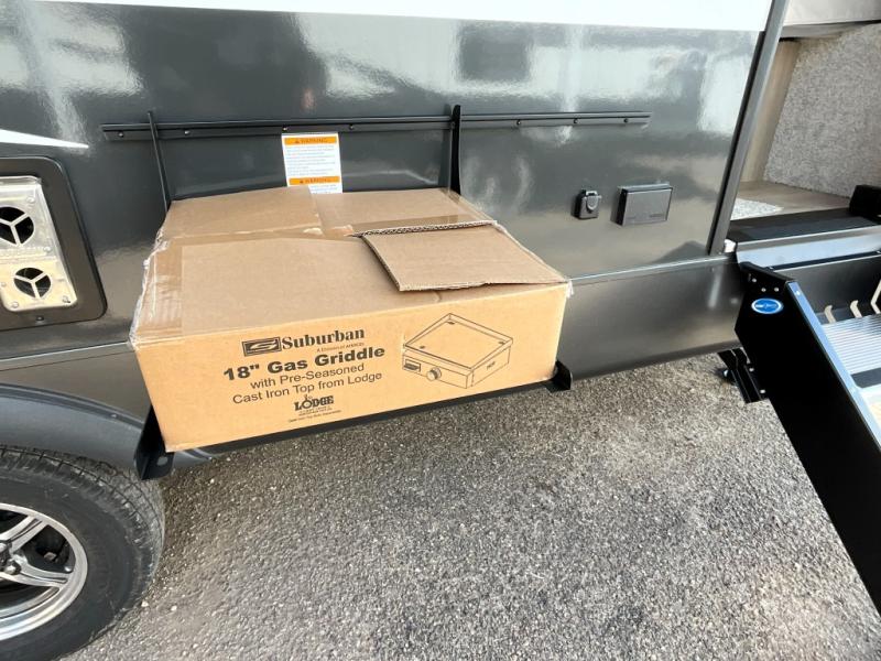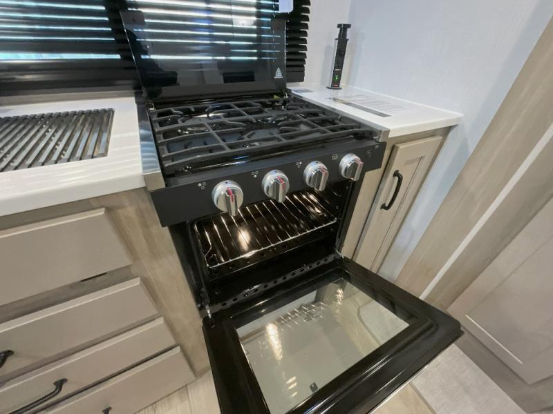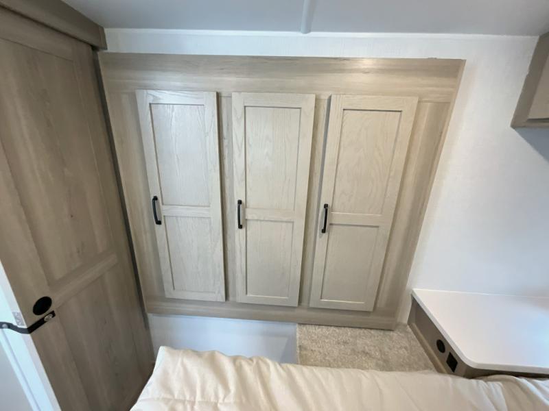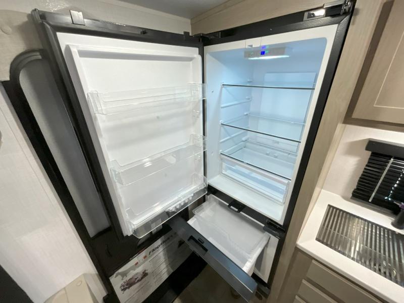 Trips to your favorite campground are made complete with this dual slide out, dual entry trailer! One entry goes straight into the front master bedroom where you'll find an RV queen bed with flip-up storage, a wardrobe slide out, and easy access into the walk-through bath. Once you're through the bath, you'll find the main living area, rear kitchen, and the second entry door at the back. Your crew can play a game at the 39" booth dinette or relax on the theater seat across from the TV. The kitchen includes everything you need to prepare meals in the morning, including a three burner cooktop and microwave oven, plus a 12V refrigerator and a pantry for food storage.