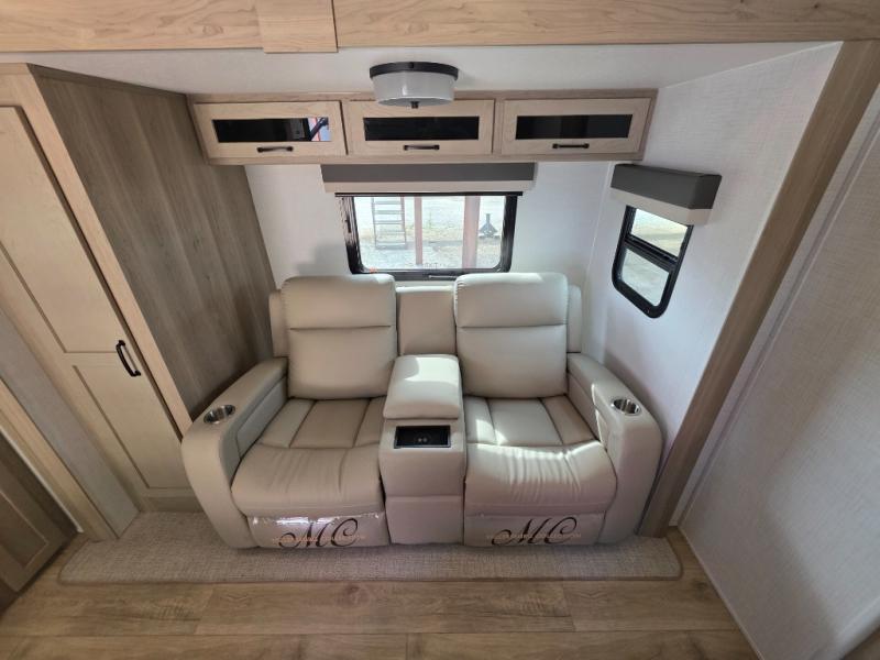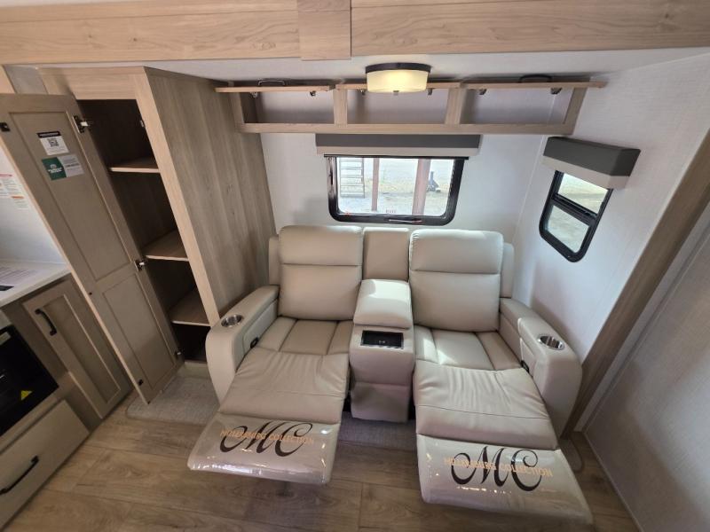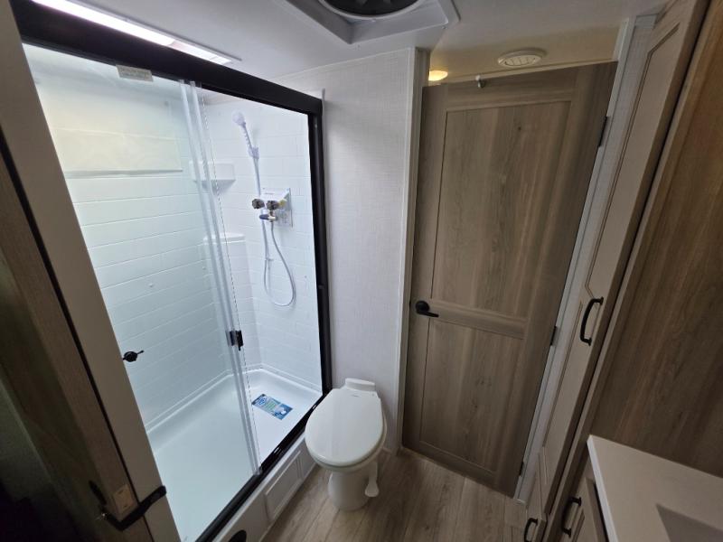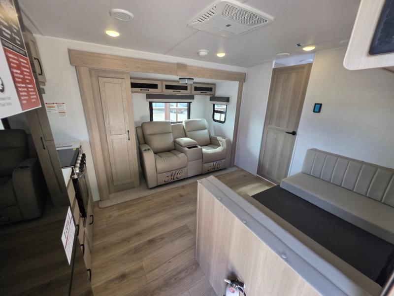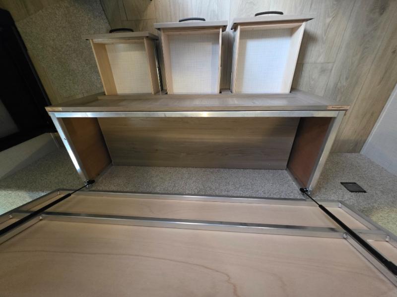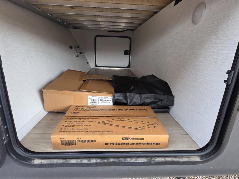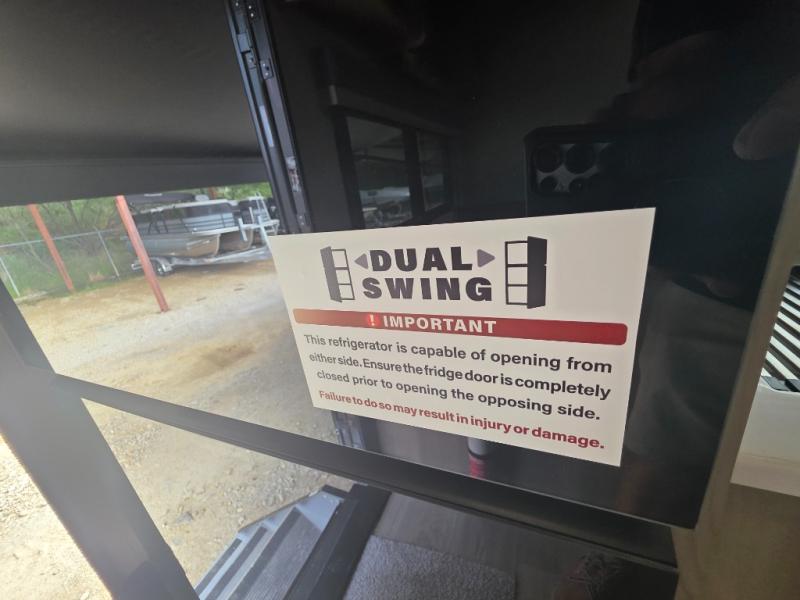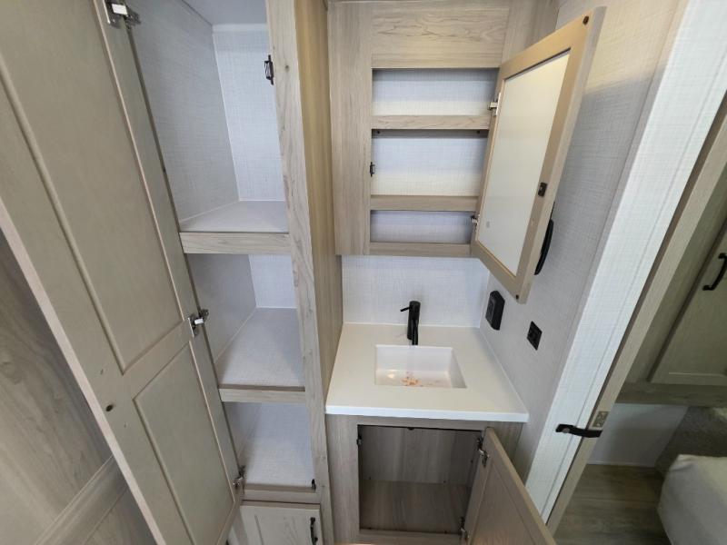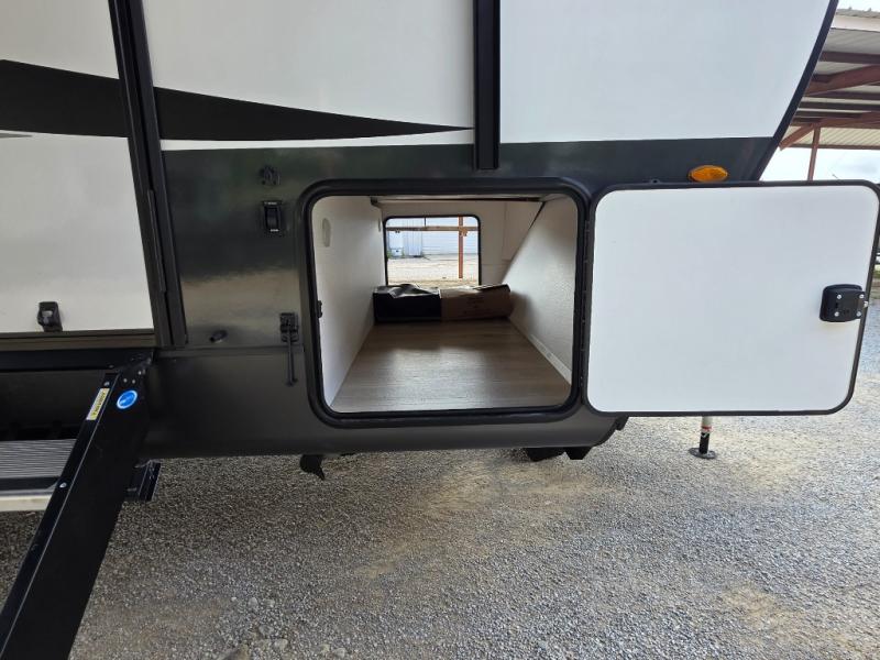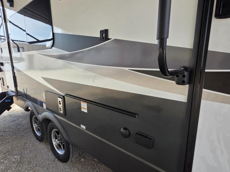 Trips to your favorite campground are made complete with this dual slide out, dual entry trailer! One entry goes straight into the front master bedroom where you'll find an RV queen bed with flip-up storage, a wardrobe slide out, and easy access into the walk-through bath. Once you're through the bath, you'll find the main living area, rear kitchen, and the second entry door at the back. Your crew can play a game at the 39" booth dinette or relax on the theater seat across from the TV. The kitchen includes everything you need to prepare meals in the morning, including a three burner cooktop and microwave oven, plus a 12V refrigerator and a pantry for food storage.