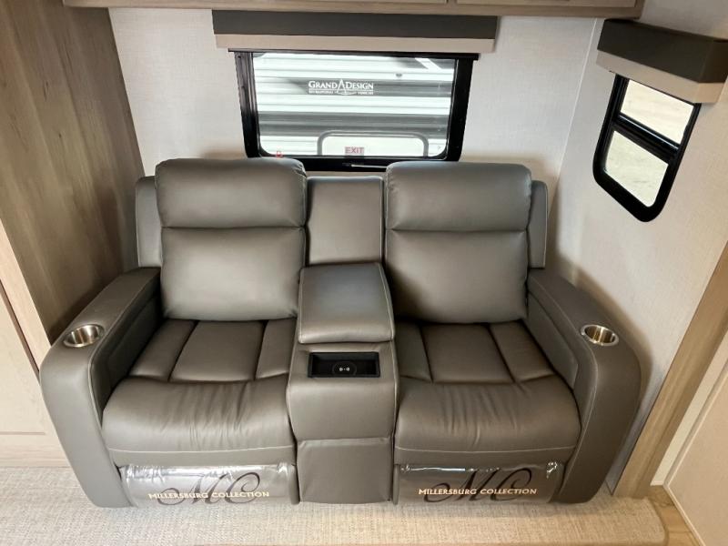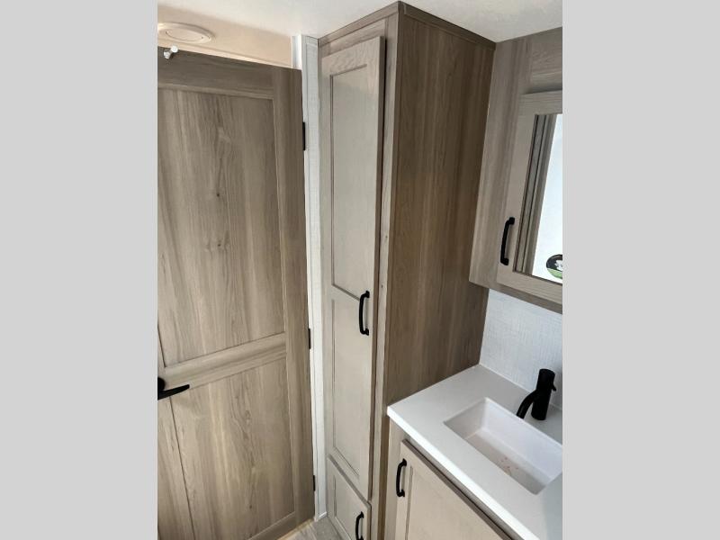 Trips to your favorite campground are made complete with this dual slide out, dual entry trailer! One entry goes straight into the front master bedroom where you'll find an RV queen bed with flip-up storage, a wardrobe slide out, and easy access into the walk-through bath. Once you're through the bath, you'll find the main living area, rear kitchen, and the second entry door at the back. Your crew can play a game at the 39" booth dinette or relax on the theater seat across from the TV. The kitchen includes everything you need to prepare meals in the morning, including a three burner cooktop and microwave oven, plus a 12V refrigerator and a pantry for food storage.