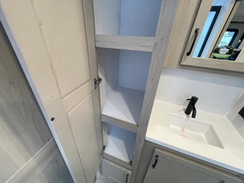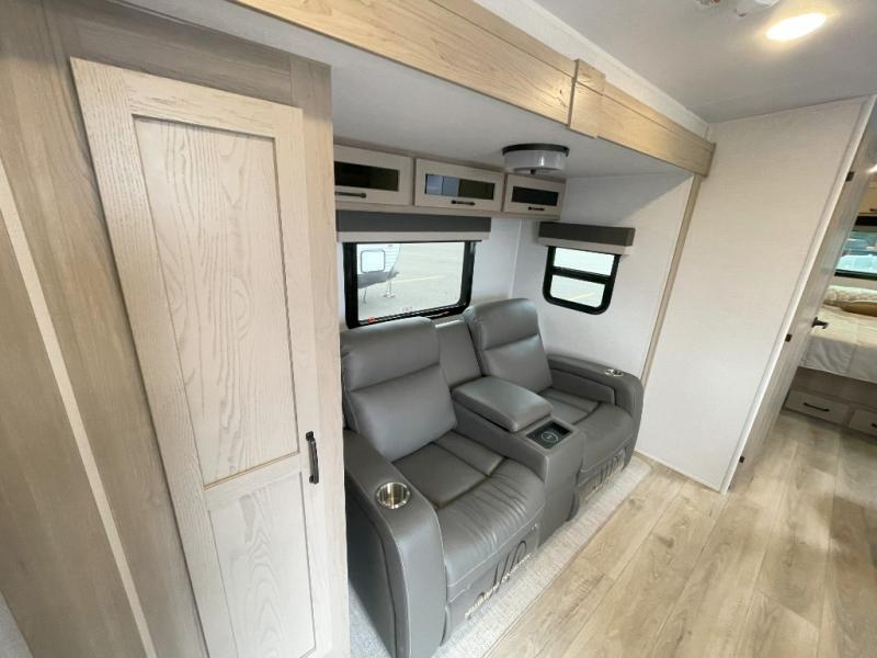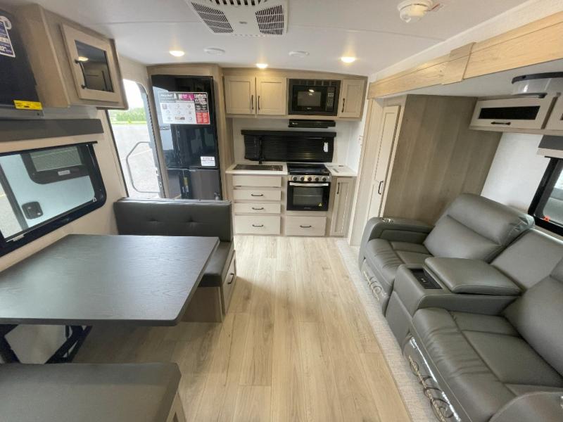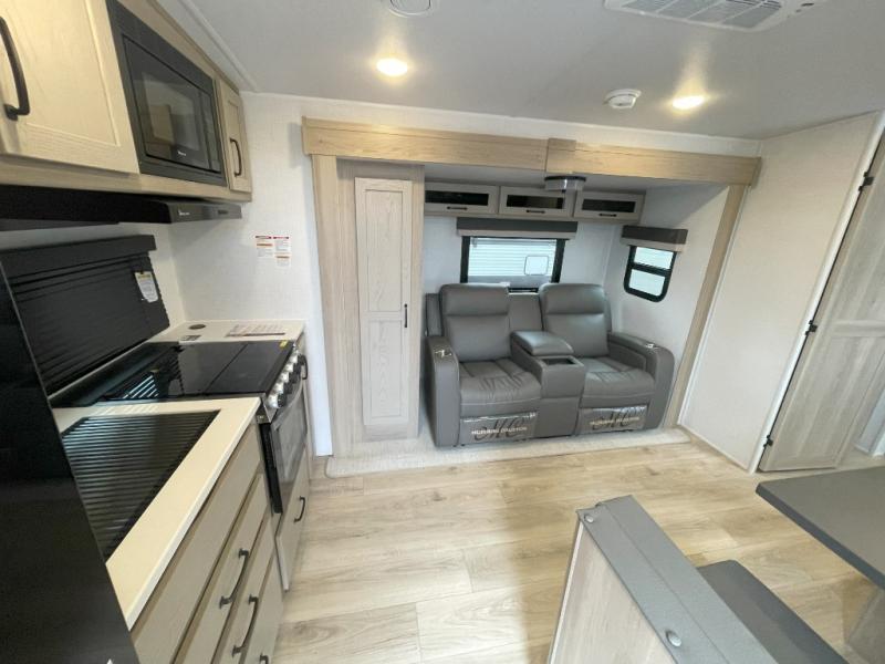 Trips to your favorite campground are made complete with this dual slide out, dual entry trailer! One entry goes straight into the front master bedroom where you'll find an RV queen bed with flip-up storage, a wardrobe slide out, and easy access into the walk-through bath. Once you're through the bath, you'll find the main living area, rear kitchen, and the second entry door at the back. Your crew can play a game at the 39" booth dinette or relax on the theater seat across from the TV. The kitchen includes everything you need to prepare meals in the morning, including a three burner cooktop and microwave oven, plus a 12V refrigerator and a pantry for food storage.