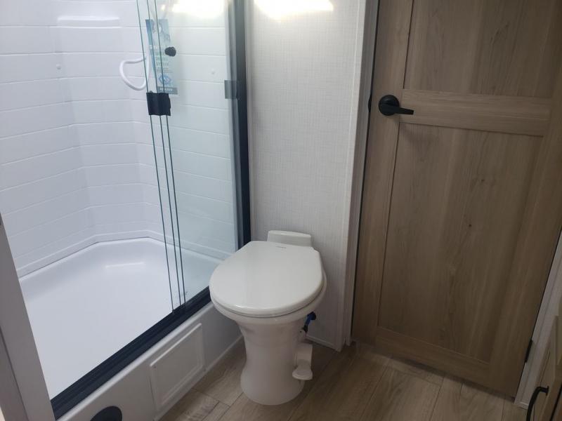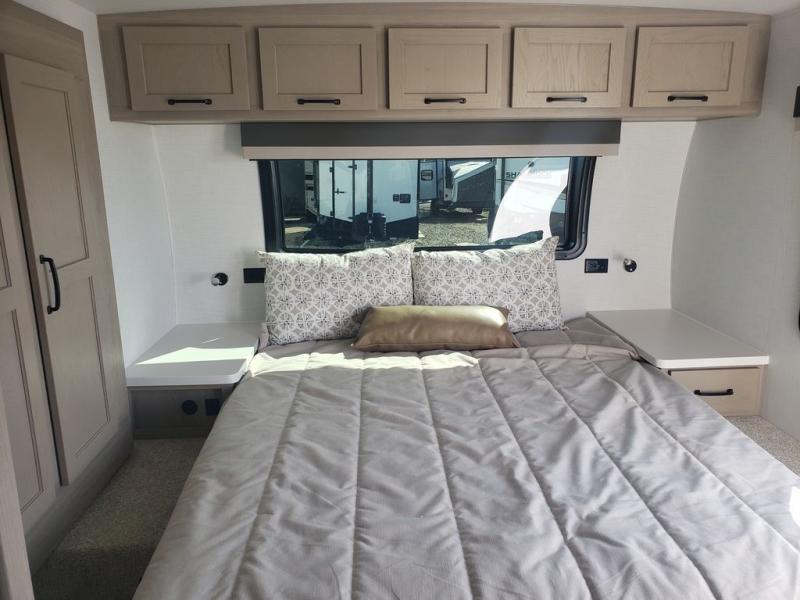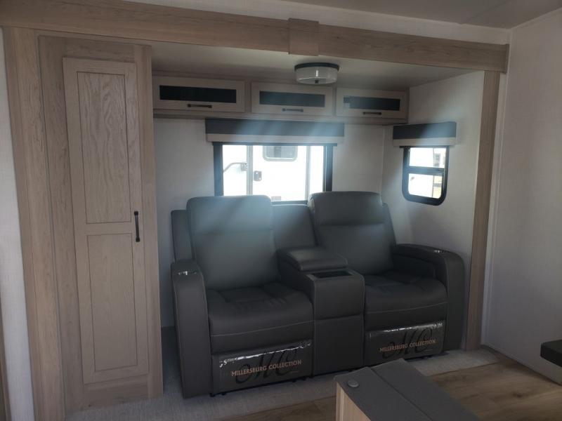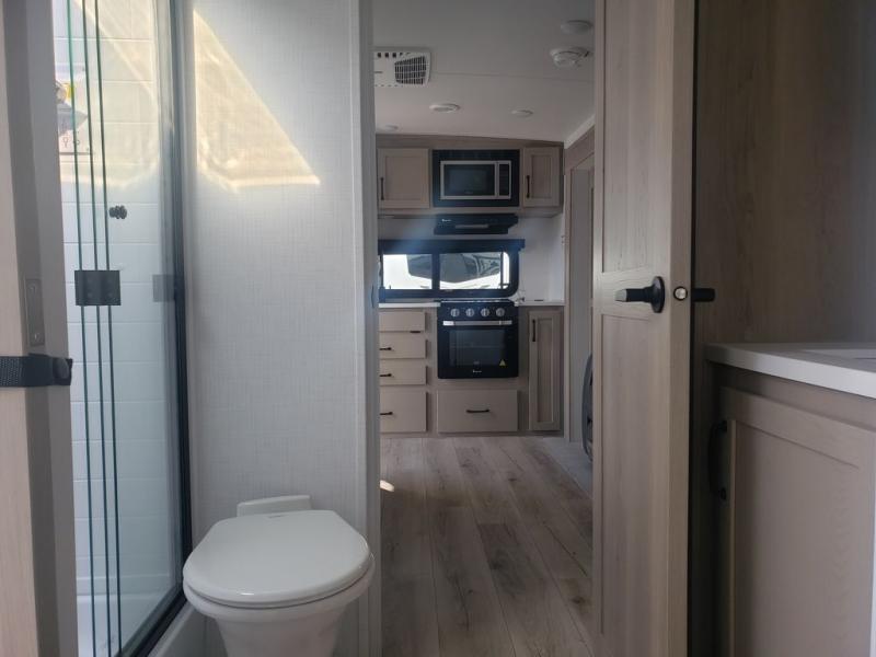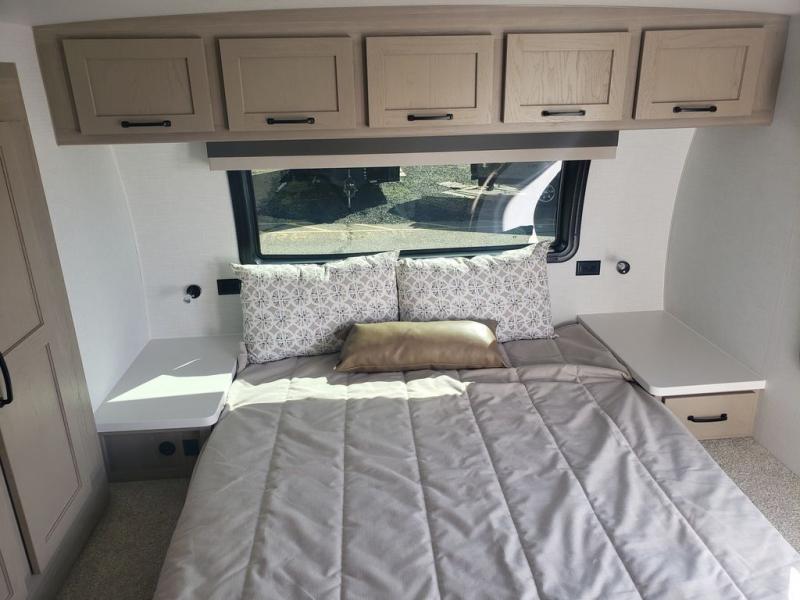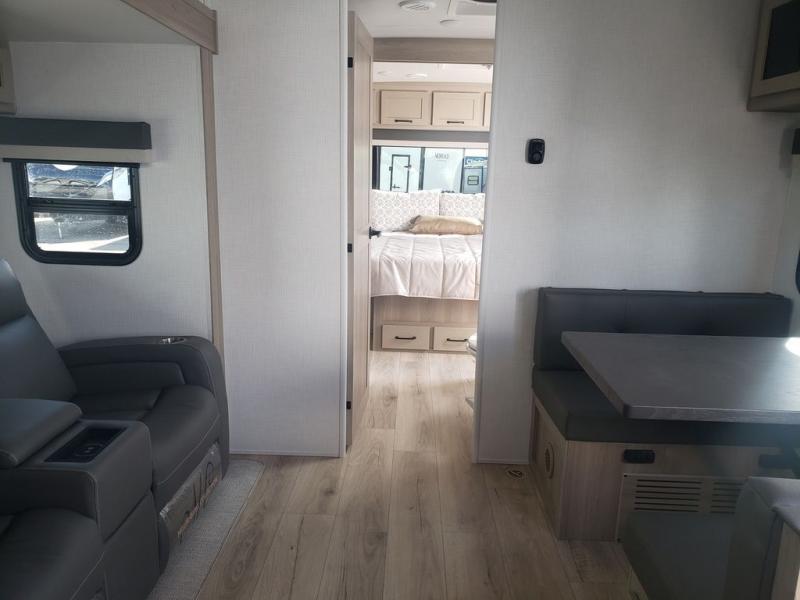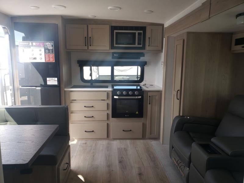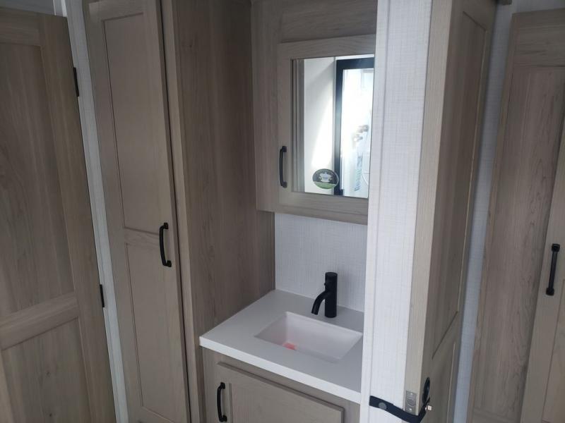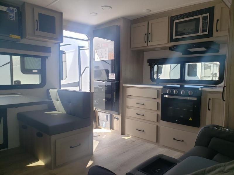 Trips to your favorite campground are made complete with this dual slide out, dual entry trailer! One entry goes straight into the front master bedroom where you'll find an RV queen bed with flip-up storage, a wardrobe slide out, and easy access into the walk-through bath. Once you're through the bath, you'll find the main living area, rear kitchen, and the second entry door at the back. Your crew can play a game at the 39" booth dinette or relax on the theater seat across from the TV. The kitchen includes everything you need to prepare meals in the morning, including a three burner cooktop and microwave oven, plus a 12V refrigerator and a pantry for food storage.
