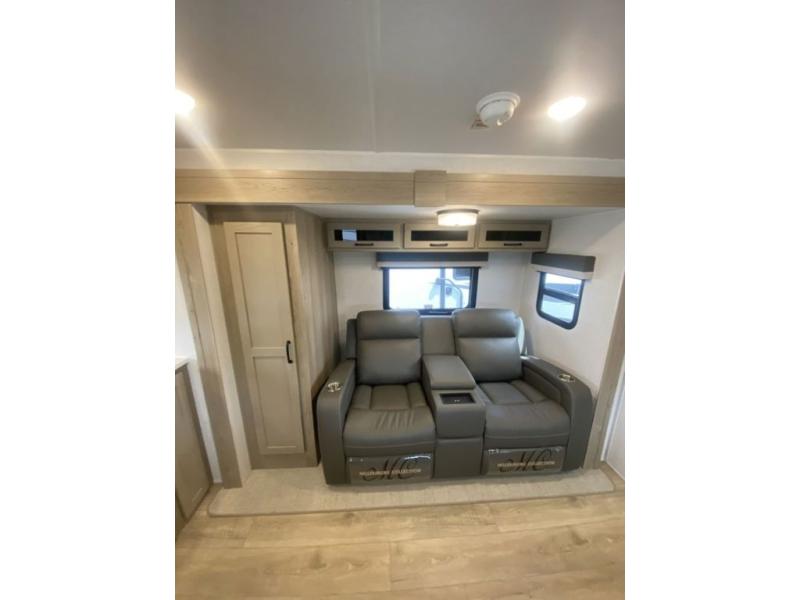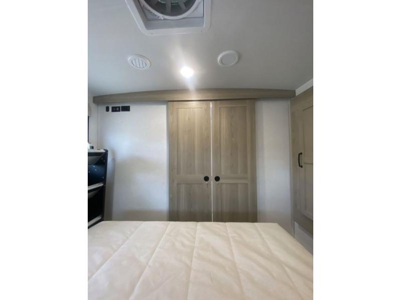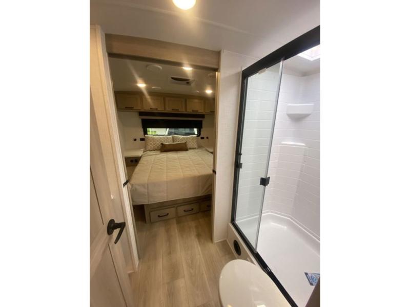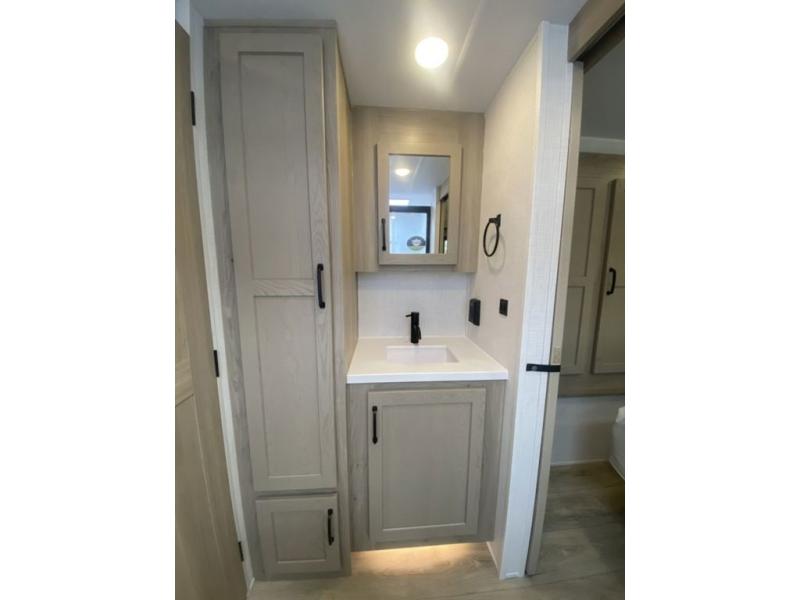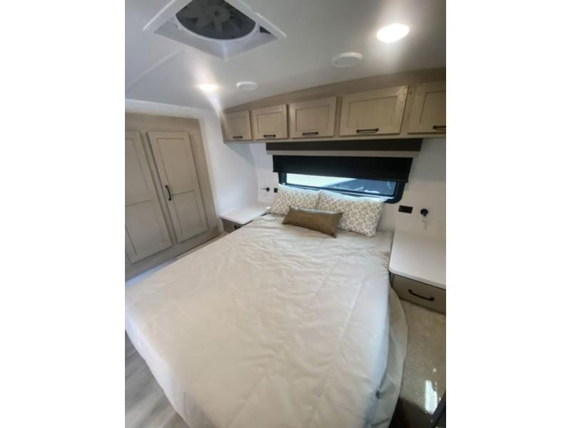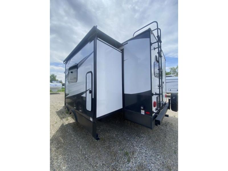 Trips to your favorite campground are made complete with this dual slide out, dual entry trailer! One entry goes straight into the front master bedroom where you'll find an RV queen bed with flip-up storage, a wardrobe slide out, and easy access into the walk-through bath. Once you're through the bath, you'll find the main living area, rear kitchen, and the second entry door at the back. Your crew can play a game at the 39" booth dinette or relax on the theater seat across from the TV. The kitchen includes everything you need to prepare meals in the morning, including a three burner cooktop and microwave oven, plus a 12V refrigerator and a pantry for food storage.