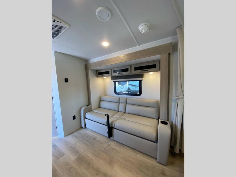 This floorplan offers a front Murphy bed that easily folds away to reveal a cozy sofa, opening up your living space during the day. A slide-out with a full dinette gives you added room to relax or work, and the fully equipped kitchen includes a 3-burner cooktop, microwave, and double-door fridge. The spacious rear bathroom provides a full shower, linen storage, and wardrobe space.