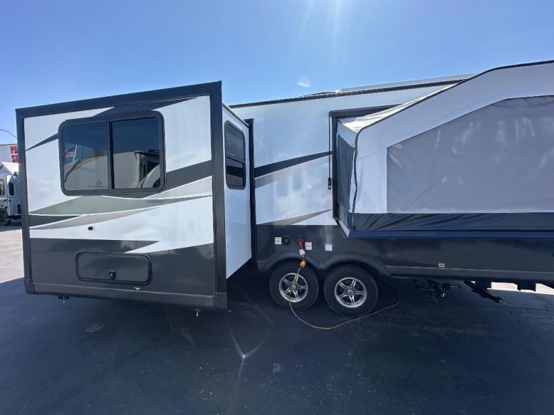 If you're looking for more sleeping space and added interior space, your search is over! This expandable includes three queen tent end beds, plus a U-shaped dinette and a flip sofa to sleep nine! A three burner cooktop and microwave oven in the kitchen will allow you to prepare meals each day, and there is an added exterior griddle for dinner outside. This model also includes an impressive amount of storage, including a kitchen pantry and exterior storage for hiking gear and tackle boxes!