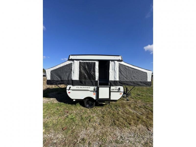 With any Flagstaff OTG (Off The Ground) folding pop-up camper by Forest River, you will enjoy a more simple approach to outdoor fun. If you're a regular tent camper, but are looking for a little more comfort, then take a look at these easy-to-tow models! There are electric brakes, balancing bead filled tires, and leaf spring axles that provide that easy towing, and the alloy fiberglass exterior is sure to be eye-catching. A one-piece screen door also comes standard so you can let fresh air in, while keeping bugs out, and the LED interior lights will be an added benefit you didn't have while tent camping. Each model also includes residential style cabinet doors, wood look flooring, and an Andover Sable wood interior for a more outdoorsy feel!