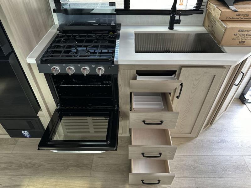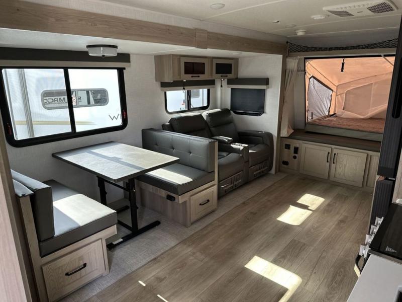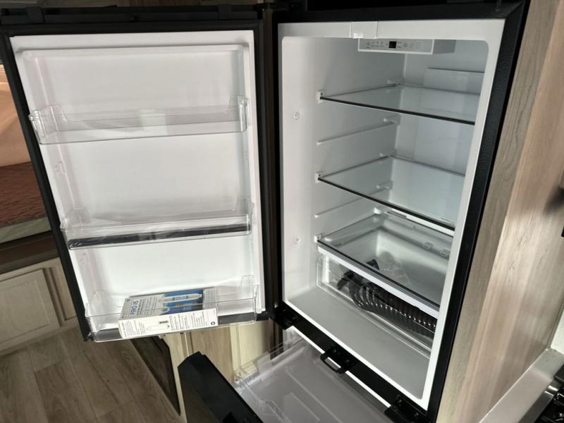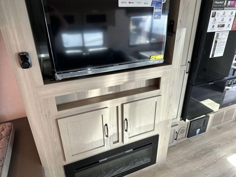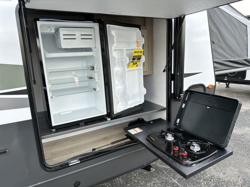 You will feel right at home in this spacious expandable thanks to the large slide out and the fireplace with a TV. Within the slide you'll find a booth dinette and hide-a-bed sofa, or you can choose the optional theater seat in place of the sofa. There is a full kitchen with a three burner cooktop, a 12V refrigerator, plus a microwave oven, and if you enjoy cooking outdoors, you're going to love the outside kitchen! You'll also find an 18' power awning outdoors, along with three exterior storage compartments and Solid Step entry steps.