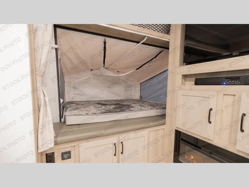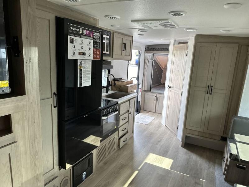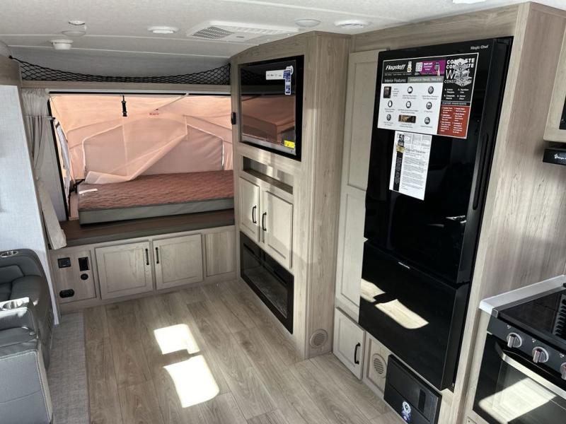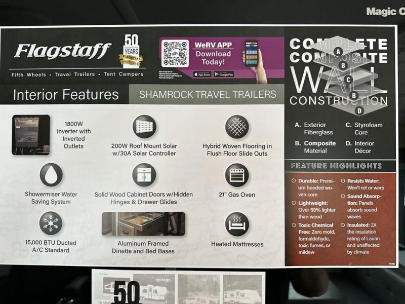 Each Flagstaff Shamrock expandable by Forest River includes an enclosed underbelly, interior and exterior composite sidewall construction, and a vinyl/rubber composite roofing membrane for added durability. The power tongue jack will make hitching up easier than ever, and the torsion axle, Rubber-Ryde suspension and Goodyear Endurance tires will provide smooth towing. You will also appreciate having a 200W roof solar panel with a 1800W inverter, an outside spray port, Keyed-Alike locks, plus many more exterior conveniences. The interior is made to feel more like home with solid wood cabinet doors and drawers, marine grade carpet in the slides, Sedona Wood cabinetry, plus seamless kitchen countertops.