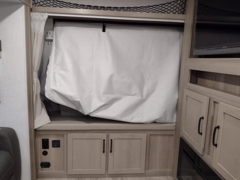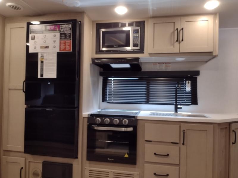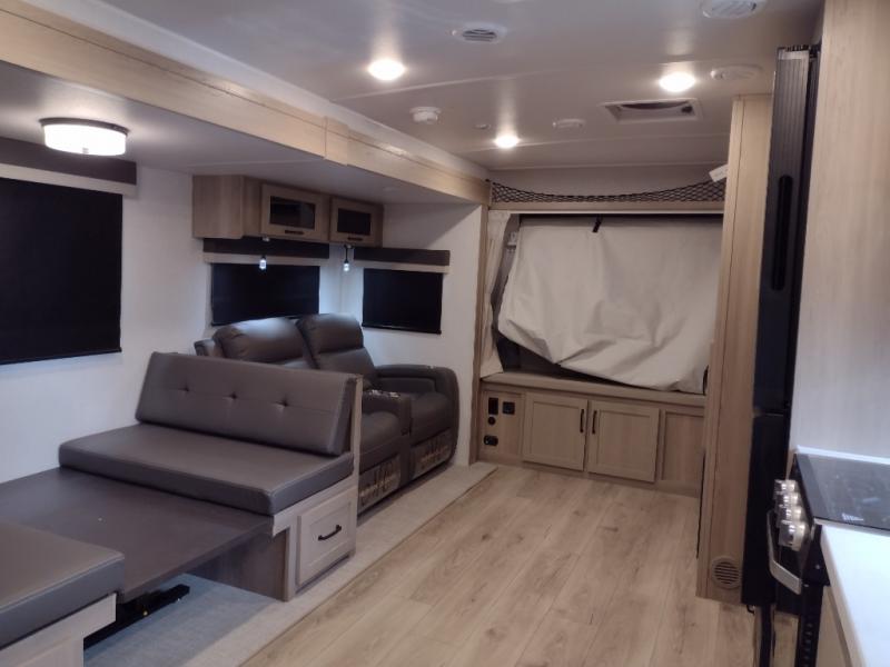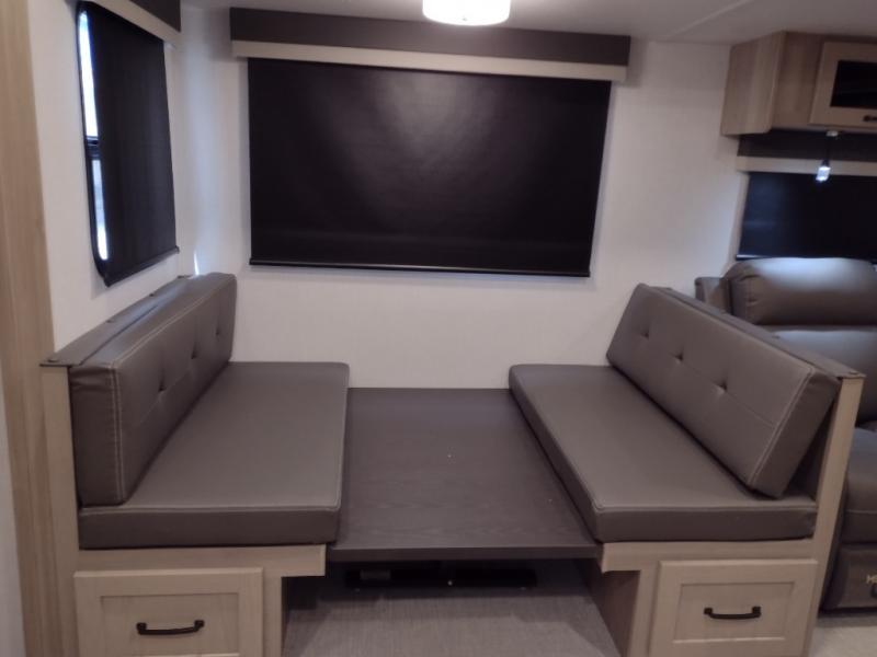 You will feel right at home in this spacious expandable thanks to the large slide out and the fireplace with a TV. Within the slide you'll find a booth dinette and hide-a-bed sofa, or you can choose the optional theater seat in place of the sofa. There is a full kitchen with a three burner cooktop, a 12V refrigerator, plus a microwave oven, and if you enjoy cooking outdoors, you're going to love the outside kitchen! You'll also find an 18' power awning outdoors, along with three exterior storage compartments and Solid Step entry steps.