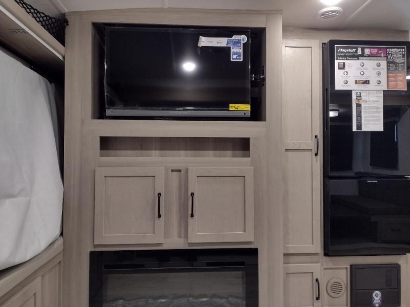 Each Flagstaff Shamrock expandable by Forest River includes an enclosed underbelly, interior and exterior composite sidewall construction, and a vinyl/rubber composite roofing membrane for added durability. The power tongue jack will make hitching up easier than ever, and the torsion axle, Rubber-Ryde suspension and Goodyear Endurance tires will provide smooth towing. You will also appreciate having a 200W roof solar panel with a 1800W inverter, an outside spray port, Keyed-Alike locks, plus many more exterior conveniences. The interior is made to feel more like home with solid wood cabinet doors and drawers, marine grade carpet in the slides, Sedona Wood cabinetry, plus seamless kitchen countertops.