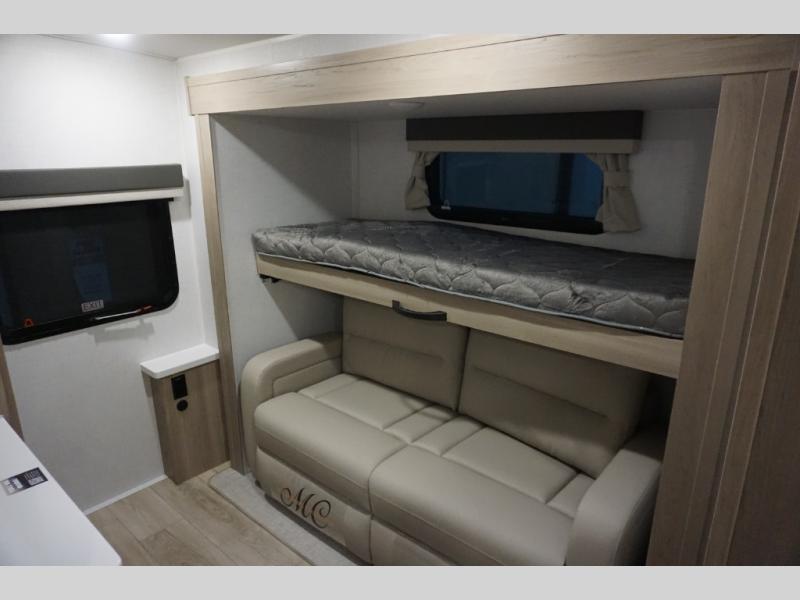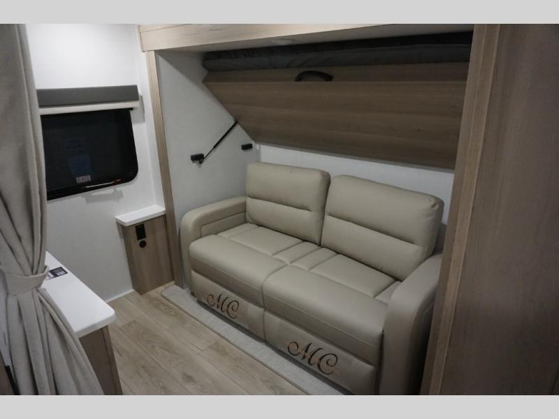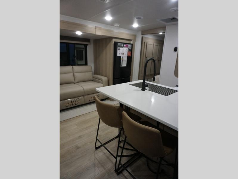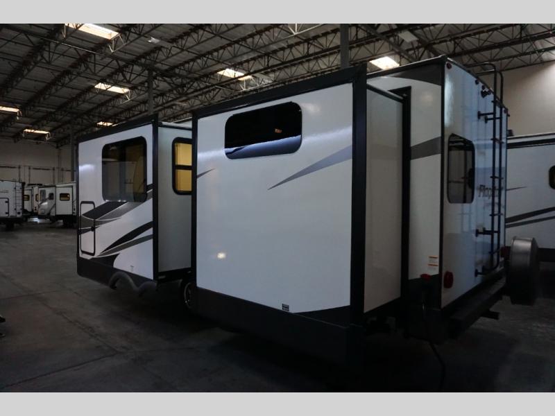 Camping with friends and family has never been easier than with this lightweight travel trailer! There is a semi-private bunkhouse in the rear corner with a privacy curtain, a sofa slide out, and a flip-up bunk. The full bath with its own exterior entry door is close by to make nighttime restroom breaks easy for the little ones, and you'll enjoy the front private bedroom all to yourselves. Here, you can sleep soundly on the queen bed, store your clothes in the wardrobe slide, and sneak out early to fish through the second entry door; how convenient! The middle living area and kitchen includes a third slide out, a theater seat across from the TV, and a countertop with stools where campers can visit with the chef as they cook dinner. Head outside to enjoy the 21' power awning with LED lights, exterior griddle, and pass-thru storage with a steel sliding tray!