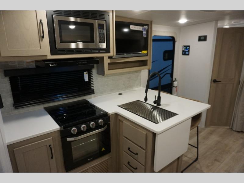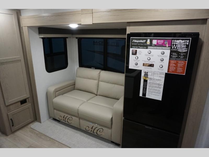 With any Flagstaff Super Lite travel trailer by Forest River the towing features include the TST tire pressure monitor system with a monitor providing safety on the road, Easy Lube axles and Nev-R adjust brakes, a power tongue jack for easy setup, and rear observation camera prep. Each is built with 6 sided aluminum framed side walls, end wall, front, floor and a roof, a plywood tongue and groove subfloor, electronically controlled heated holding tanks and an enclosed underbelly allowing you to travel during any season. The interior includes designer kitchen backsplash, solid surface kitchen countertops, Sedonwood cabinetry, and solid wood cabinet doors and drawers to make you feel right at home.