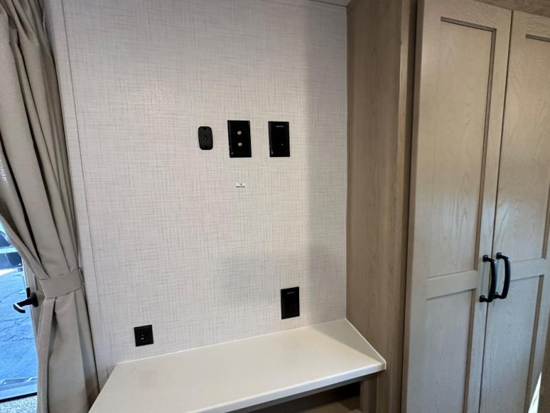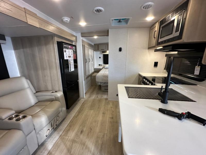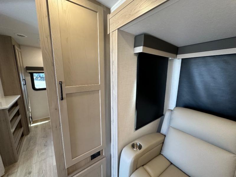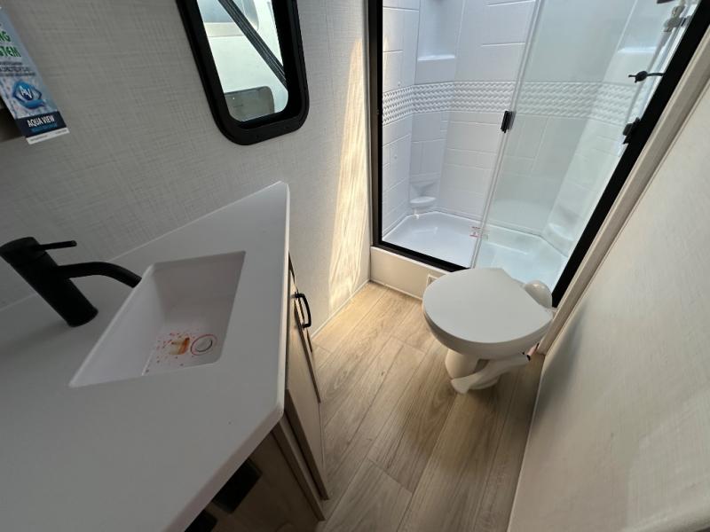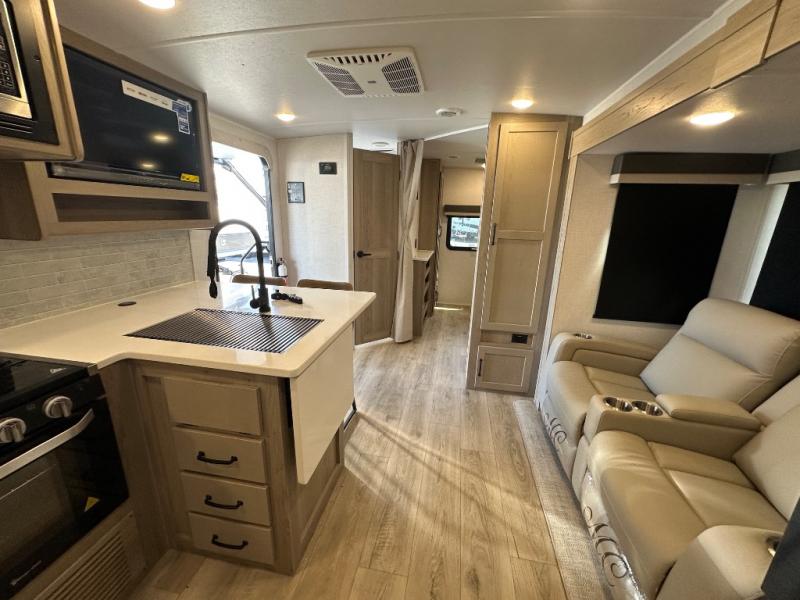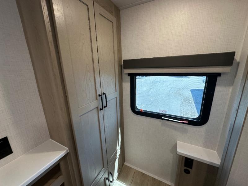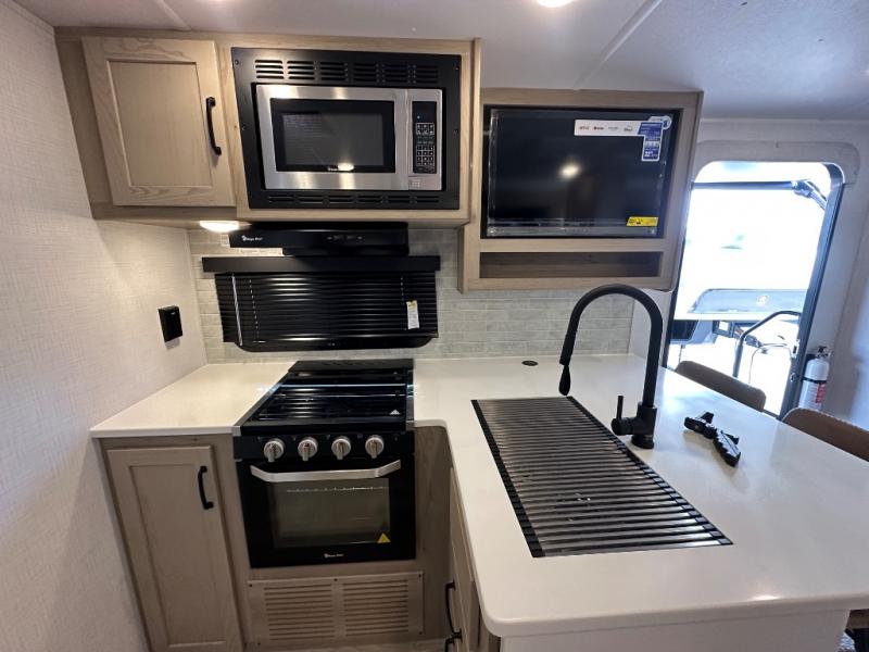 Camping with friends and family has never been easier than with this lightweight travel trailer! There is a semi-private bunkhouse in the rear corner with a privacy curtain, a sofa slide out, and a flip-up bunk. The full bath with its own exterior entry door is close by to make nighttime restroom breaks easy for the little ones, and you'll enjoy the front private bedroom all to yourselves. Here, you can sleep soundly on the queen bed, store your clothes in the wardrobe slide, and sneak out early to fish through the second entry door; how convenient! The middle living area and kitchen includes a third slide out, a theater seat across from the TV, and a countertop with stools where campers can visit with the chef as they cook dinner. Head outside to enjoy the 21' power awning with LED lights, exterior griddle, and pass-thru storage with a steel sliding tray!